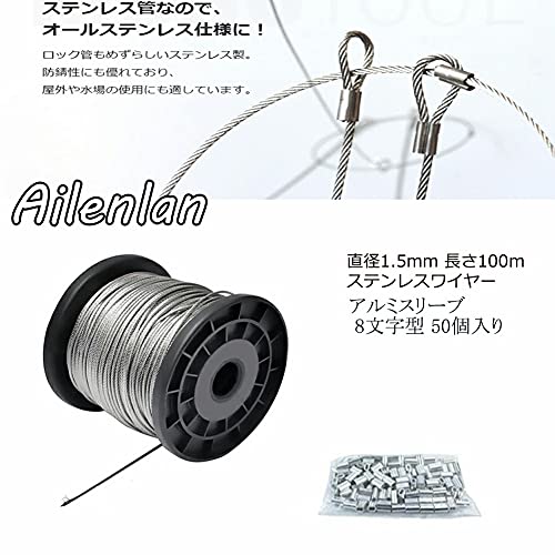 Ailenlan ワイヤーロープ ステンレスワイヤー ワイヤー ステンレス製(SUS304)直径1.5mm 長さ100m アルミスリーブ 継手 8文字型 50個入り 錆びにくい 使用荷重165kg アンテナ固定 柔軟 wire rope 地震対策 台風対策 落下防止 工事 林業 DIY フェンス 柵 (線径1.5mmx100m巻 アルミスリーブ50個入り)