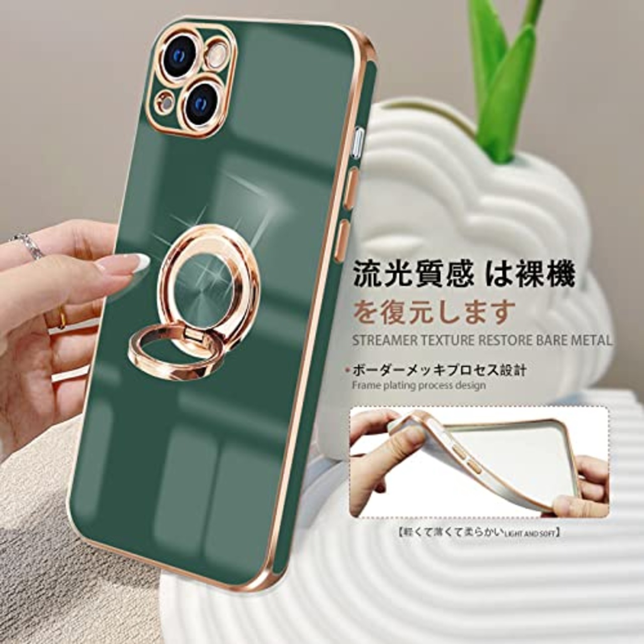 iPhone 13 ケース リング付き アイフォン13 リング カバー 全面保護 スマホケース TPU 耐衝撃 スタンド機能 車載スタンド対応 ストラップホール付き 擦り傷防止 メッキ加工 6.1インチ(ダークグリーン)