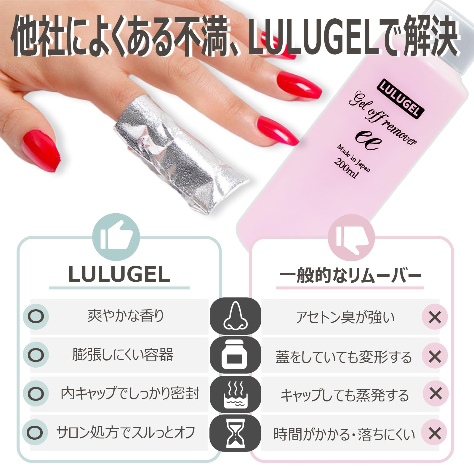 【LULUGELネイルリムーバー】日本製 LULUGELジェルネイルリムーバーは、匂いを かなり軽減できジェルを素早く強力におとします。爪に優しいアセトン ジェルネイル オフに特化した爽やかな香りのリムーバーです。サロンワークやセルフジェルネイル に大活躍し、ネイルチップ リムーバー(除光液)としても優秀です。