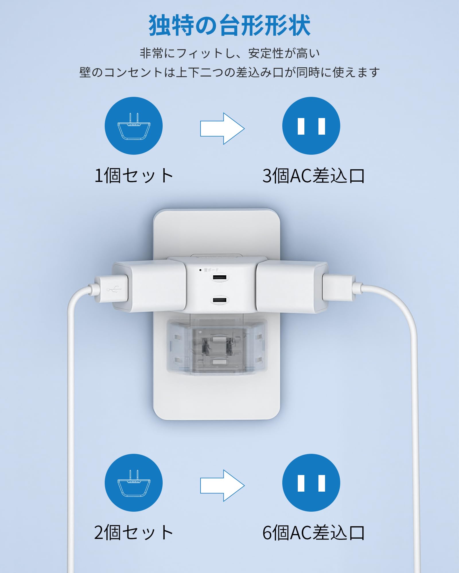 【1台3役 タップ コンセント】1つのコンセントから3口に電源を分配することができるトリプルタップです。単一のタップ電源は定格が合計1500Wまで。一度に3台の機器に同時に使用が可能です。2個セットで6台の機器に使用が可能です。色々な場所でのコンセントの増設に適用です!コンセント不足の問題を解決します。