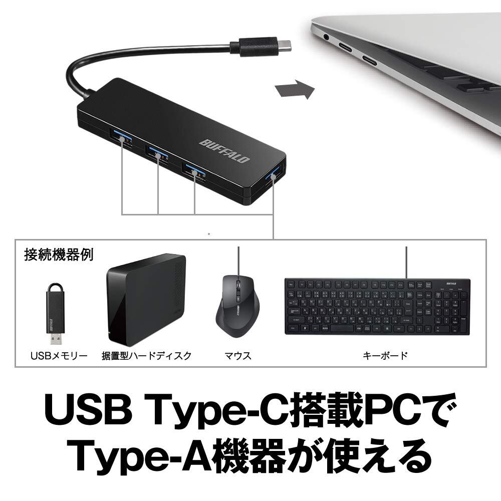 バッファロー BUFFALO USB ハブ PS5 iMac MacBook Air / Pro 対応 TypeC USB3.1 Gen1 4ポート バスパワー ブラック スリム設計 軽量 リモート テレワーク 在宅勤務 BSH4U125C1BK