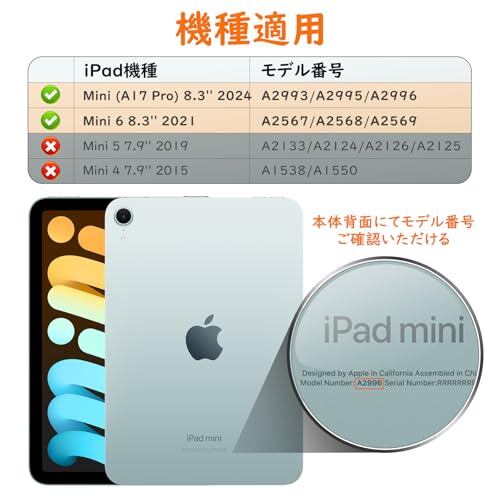 「適用機種」 New iPad Mini A17 Pro (2024、第7世代、モデル番号:A2995/A2996) / iPad Mini 6 (2021、第6世代、モデル番号:A2567/A2568/A2569) 8.3インチのタブレットに対応する専用保護ケース。その他のiPadモデルと互換性がありませんので、ご購入になる前にお使いのiPad本体の背面にあるモデル番号を確認してください。Pencil USB-C(iPad Mini A17 Pro & iPad Mini6 用)の磁気吸着、Pencil Pro(iPad Mini A17 Pro 用)及び Pencil第2世代(iPad Mini6 用)のワイヤレス充電に対応できます。