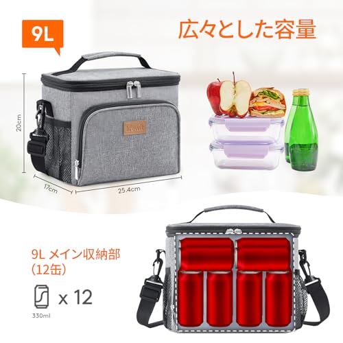 Lifewit クーラーボックス 小型 軽量 ソフトクーラー 保冷バッグ ランチバッグ 9L 手提げと肩掛け両用 3層断熱 グレー