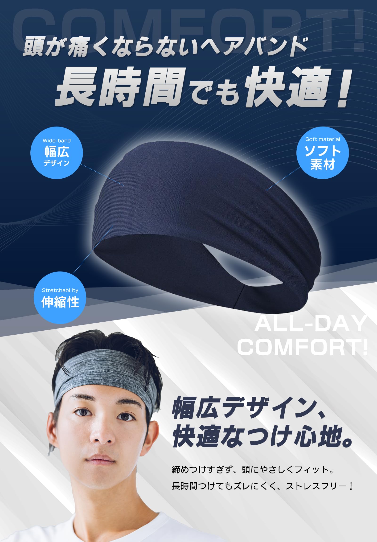 ■【肌触り抜群】 素材は伸縮性が高く、頭囲60以上の方でも強すぎる締め付け感を感じることなく着用していただけます。 サラッとした素材ですので、肌が擦れて痛くなりにくいです。男性だけでなく、女性も使用できるヘッドバンド。