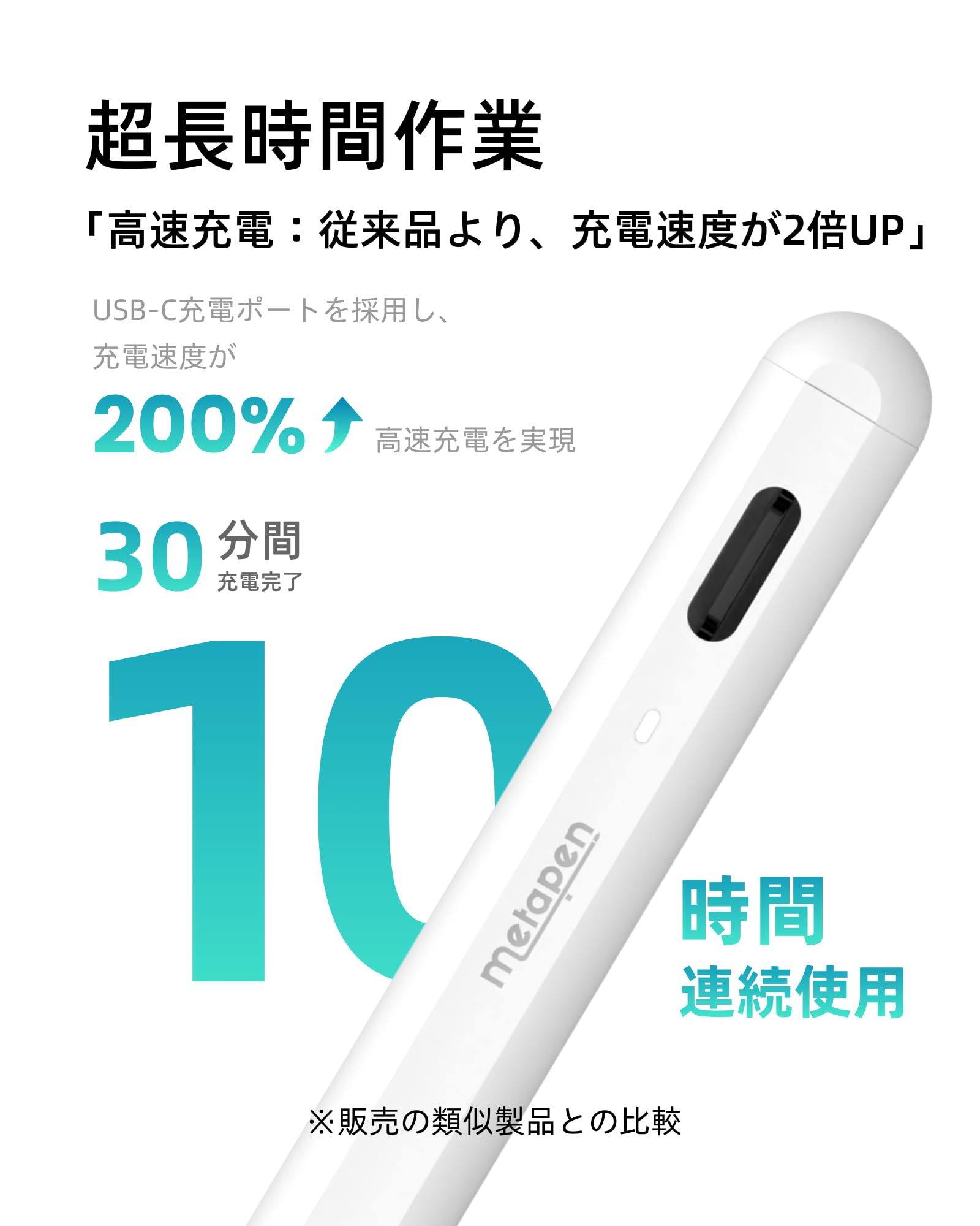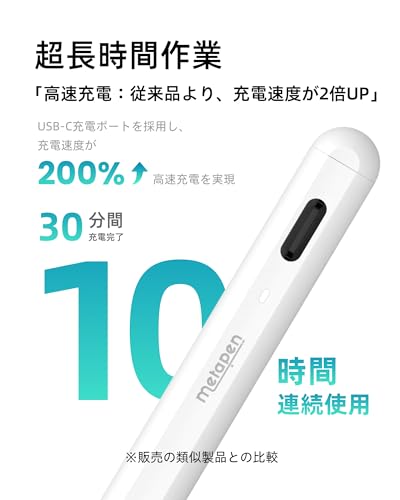 【Type-C高速充電& 長時間使用】Metapen iPad用 タッチペン A8は、充電1分で50分、充電4分で2時間使用できます。30分間フル充電でき、10時間連続使用可能になります。5分間静置し、スマートに電源を切り忘れないようにし、電力を節約します。Metapen A8の高速充電とバッテリー寿命を楽しんでください、バッテリー切れの心配はありません!