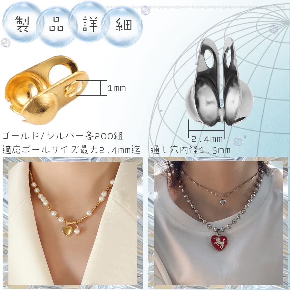 ボールチップ カシメ玉 400個セット 304 ステンレス エンドパーツ 留め具 基礎金具 ビーズ ボールチップ つぶし玉 アクセサリーパーツ 手芸用品 手作りアクセサリー DIY用 ブレスレット ネックレス用 ゴールド/シルバー各200個 (2.4mm側面開口部)