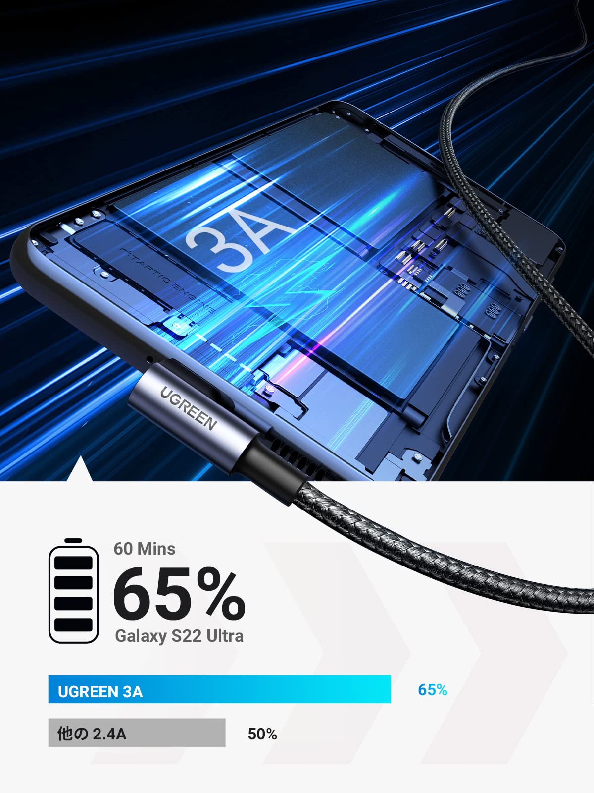 UGREEN USB Type C ケーブル USB A to USB C ケーブル L字ナイロン編み 3A急速充電 Quick Charge 3.0/2.0対応 56Kレジスタ実装 iphone17/Galaxy S24/Pixel/Google/Xperia/LG等対応等対応 (2m)