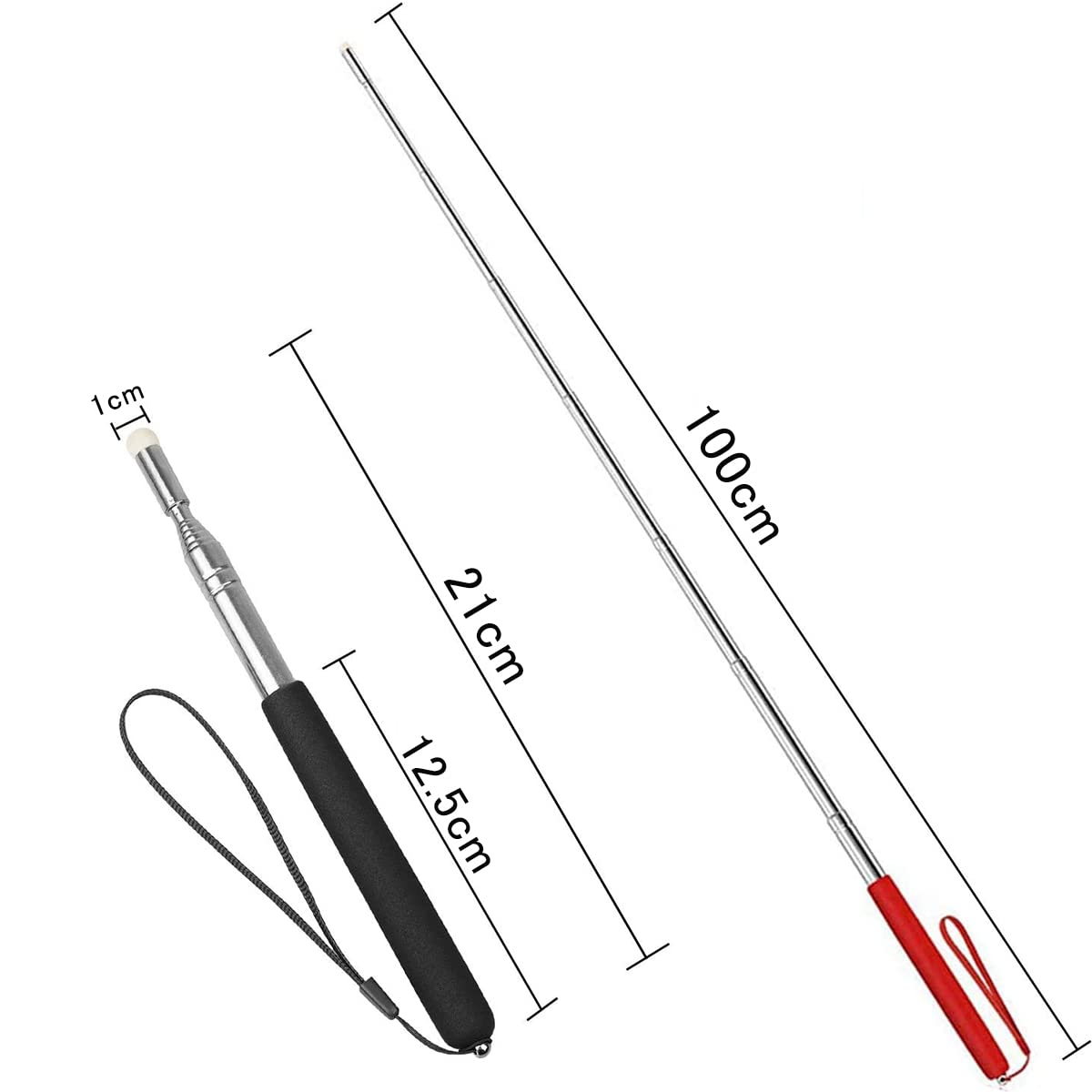 【商品仕様】パッケージ内容:指示棒*2個、掛け紐*2個,最大長さ:約100cm,縮んだ長さ:約21cm,重さ:65g。