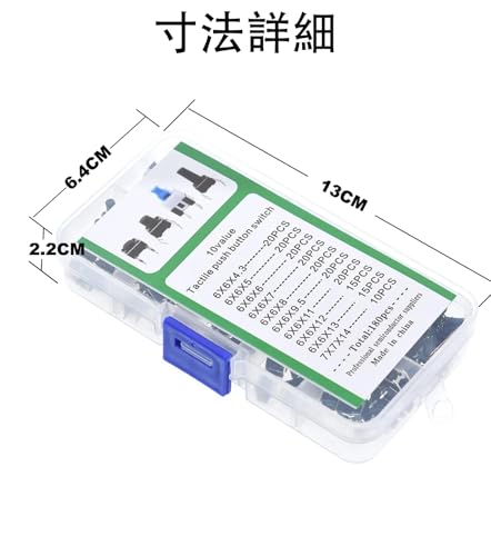 【セット内容】押しボタンスイッチ180個、10種類のサイズが含まれています。サイズは7x7x14mmから6x6x4.3mmまで、各サイズ10個から20個ずつ。プラスチックケース1個が付属しています。