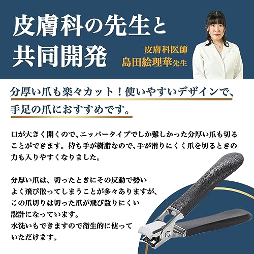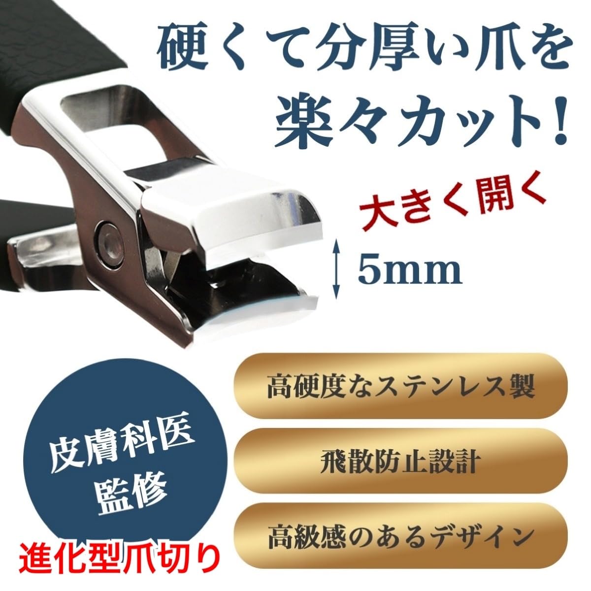 【進化したおすすめ爪切り】口が大きく開くのでニッパータイプでしか切れなかった硬くて分厚い爪も楽々カット!切った爪が飛び散らない飛散防止設計!男女問わず手足の爪にお使いいただけます。女性でも使いやすいコンパクトタイプ。