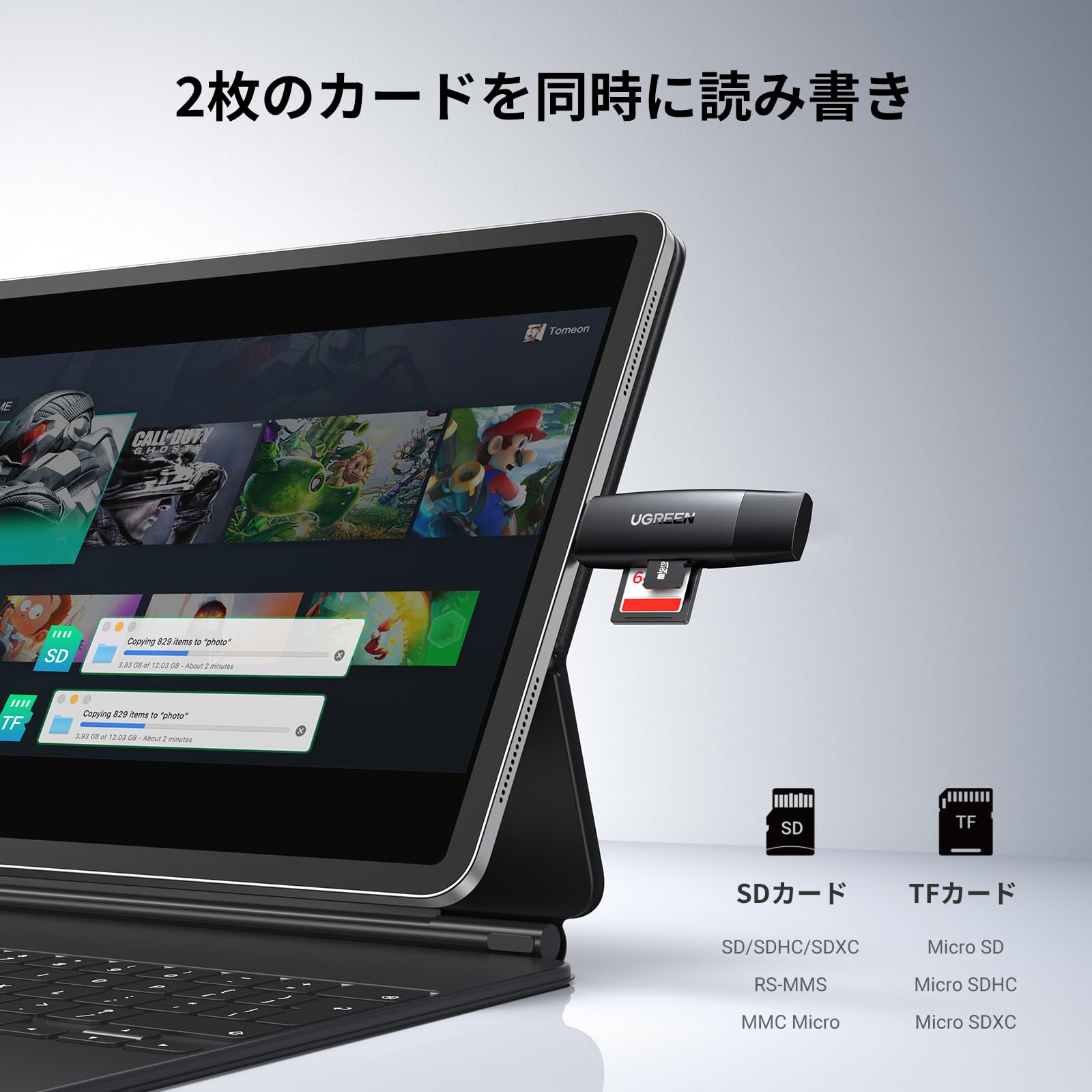 Type-C & USB3.0カードリーダー 1台2役 : UGREEN 2-in-1 SDカードリーダーはUSB-AコネクタとUSB-Cコネクタを搭載し、USB-C OTG機能に対応したAndroidスマホ、タブレット、MacBook、Windows PCに汎用できるUSBカードリーダーです。PS4、Xbox One、iPad Pro 2020/2018、Macbookシリーズ、Dell XPS 15/13、Surface Book 2、Galaxy Tab S6/Galaxy S20などに対応します。