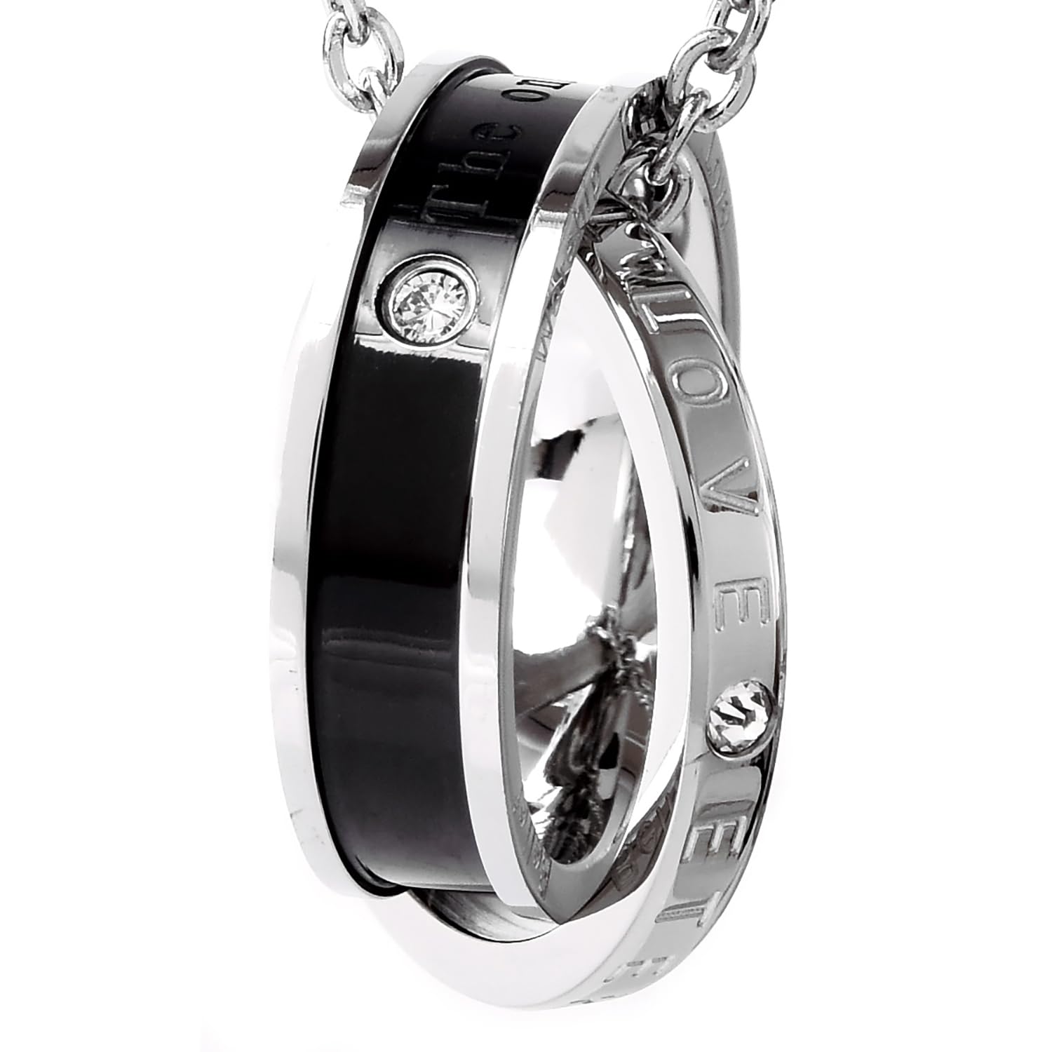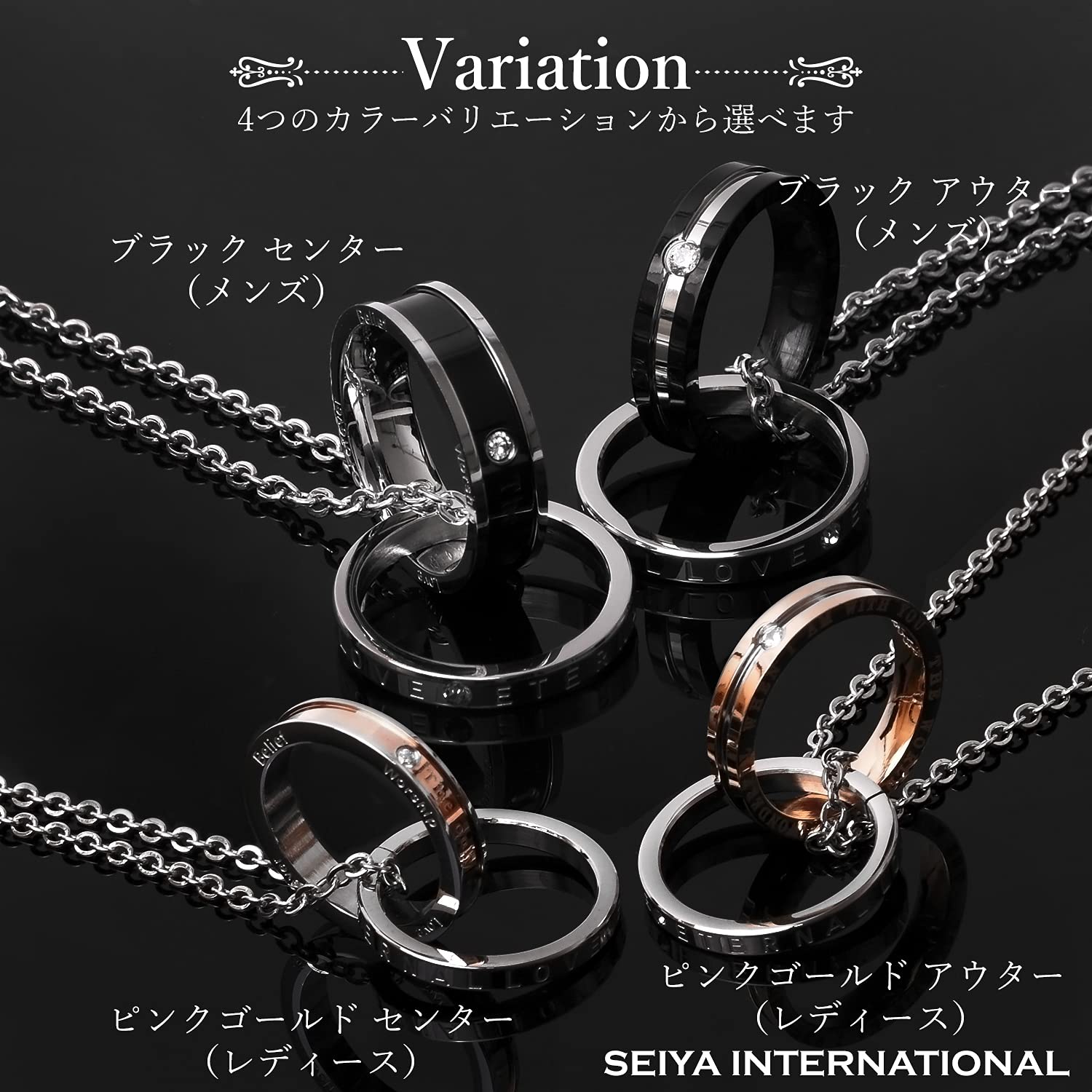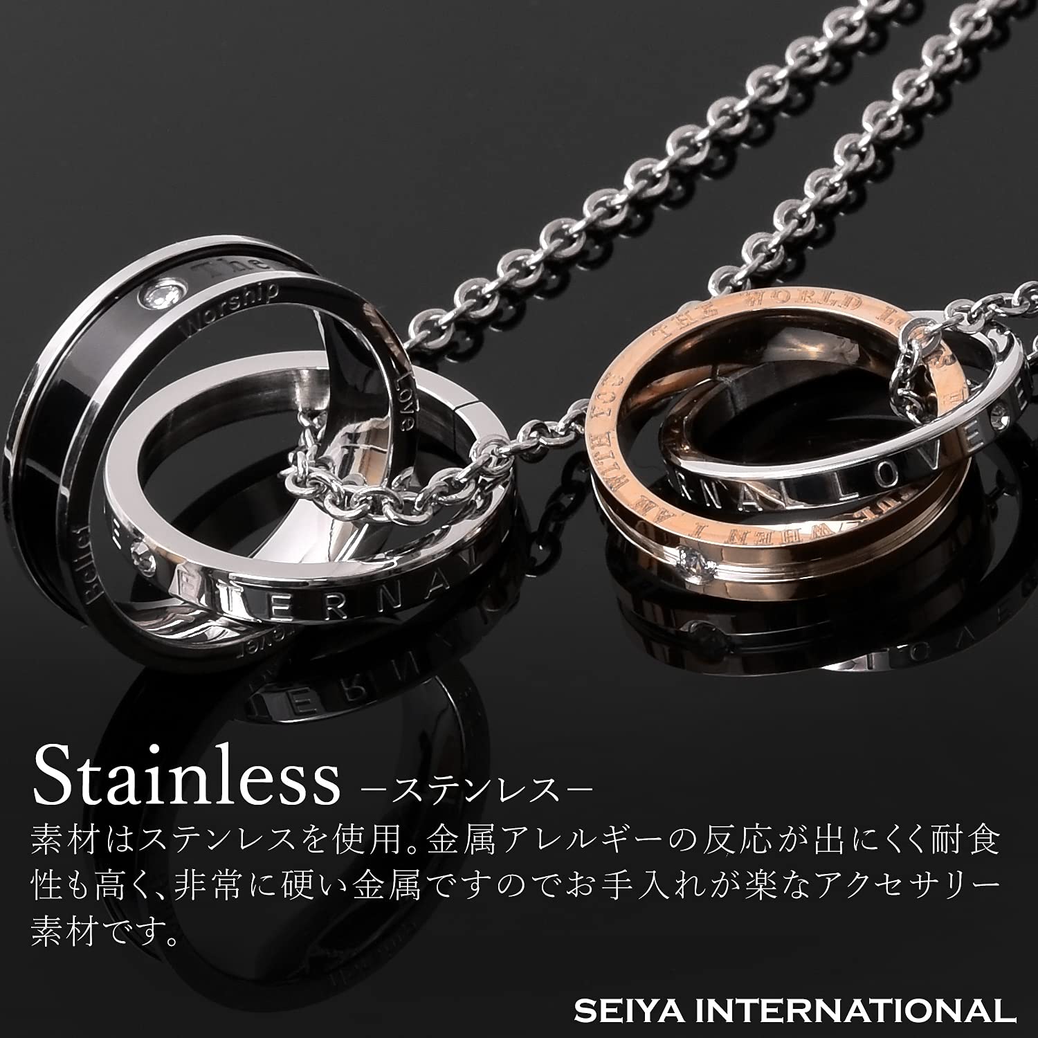 【 ペアネックレス 】ペアネックレスとは、お付き合いしている相手とお揃いで着けるネックレスです。お揃いで着けるジュエリーと言えばペアリングを思い出す方が多いかも知れませんが、実はペアネックレスも人気の高いアクセサリーです。シルバーのリングにはETERNAL LOVE(永遠の愛)が刻まれ、ブラック、ピンクゴールドの2つのリングを交差させることで、2人の永遠を演出するダブルリング。メンズにはシックでかっこいいブラック、レディースには華やかなピンクゴールドのリングがお勧めです。ペアネックレスとして、カップルでお揃いでつけるのも人気のネックレスです。
