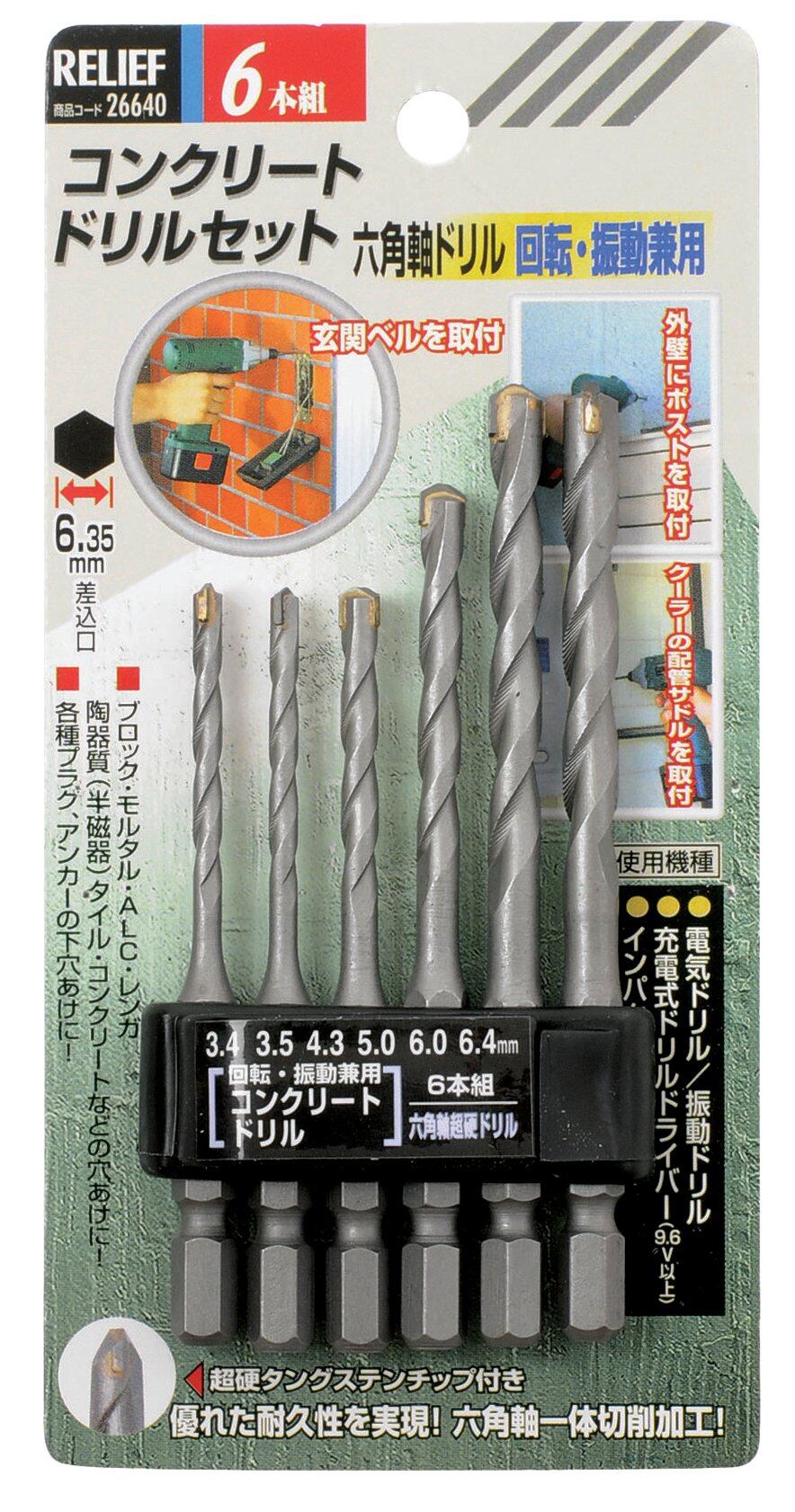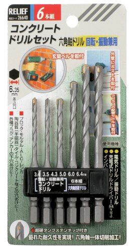 イチネンアクセス ツール事業部 イチネンアクセス RELIEF(リリーフ) コンクリートドリル 六角軸コンクリートドリルセット 6本組 26640 3.4-3.5-4.3-5.0-6.0-6.4mm
