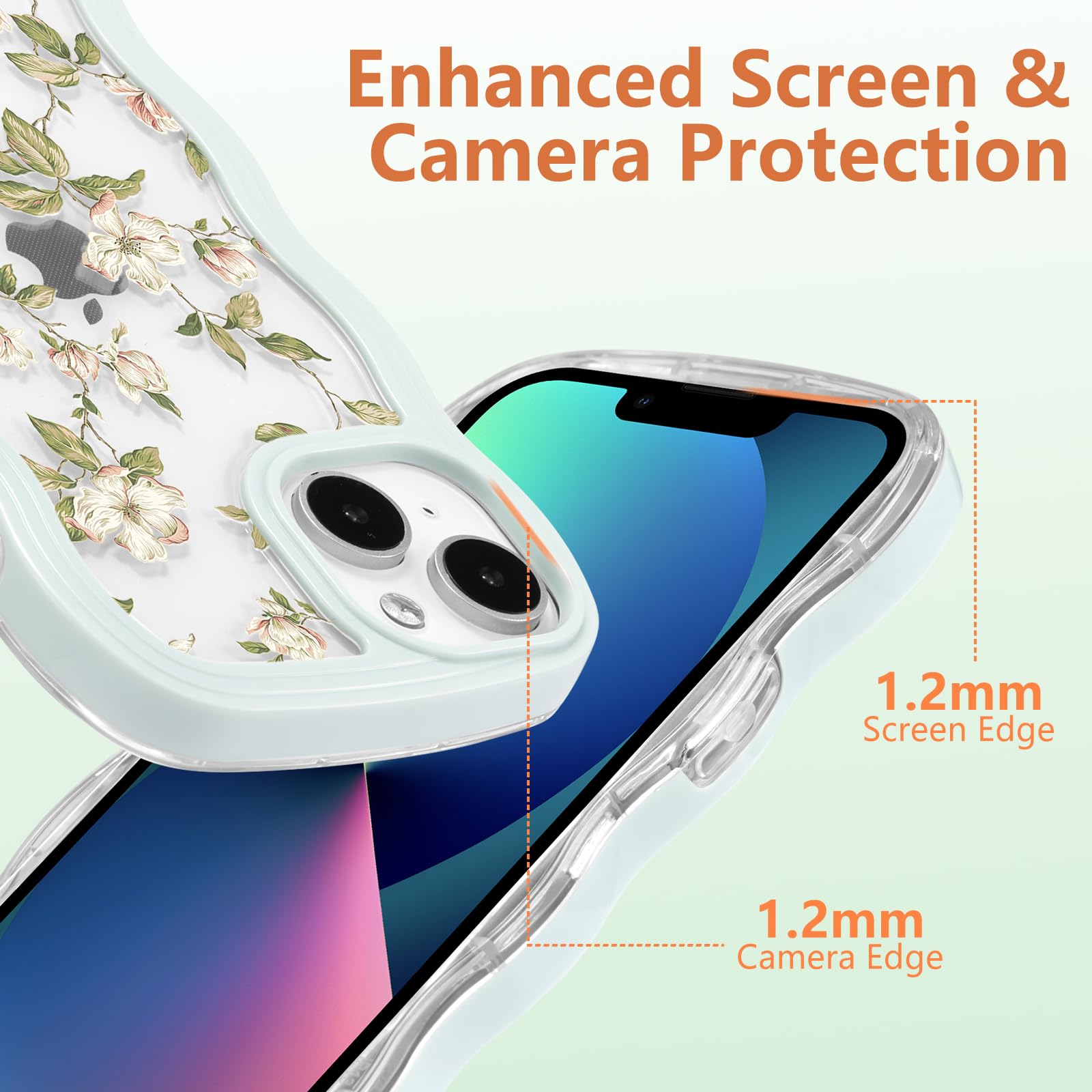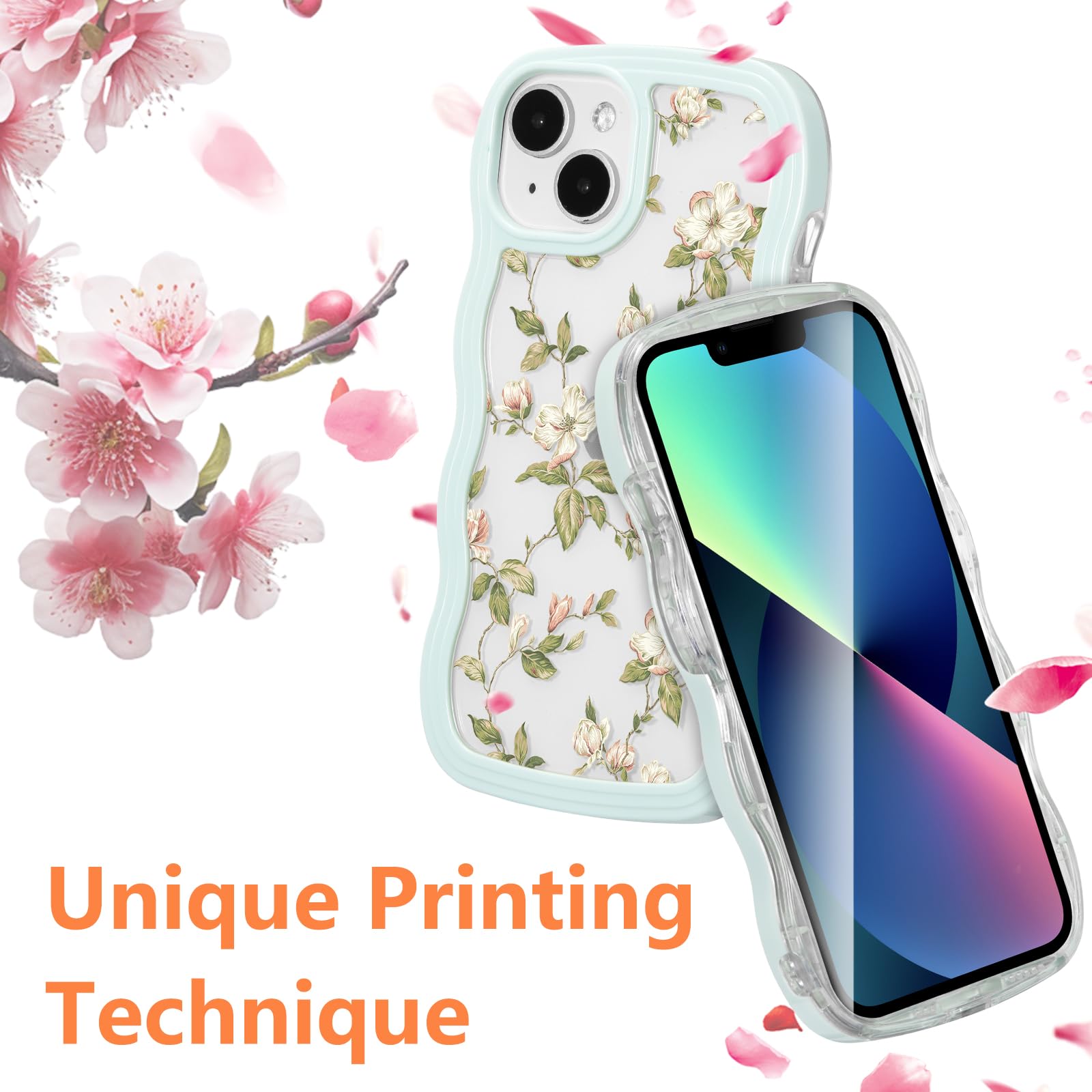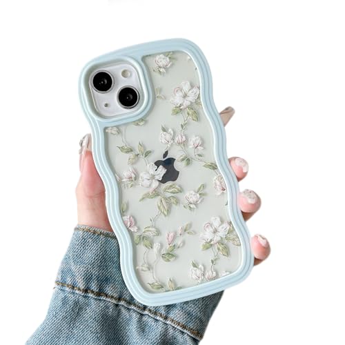 ZTOFERA iPhone 15 用 ウェーブケース おしゃれ 韓国 女子 アイフォン 15 クリアケース 人気 かわいい 花柄 花と葉 フラワー スマートケース 軽量 耐衝撃 ハード PC ソフト TPU バンパー ケース 画面レンズ保護 透明 携帯カバー (ミントグリーン)