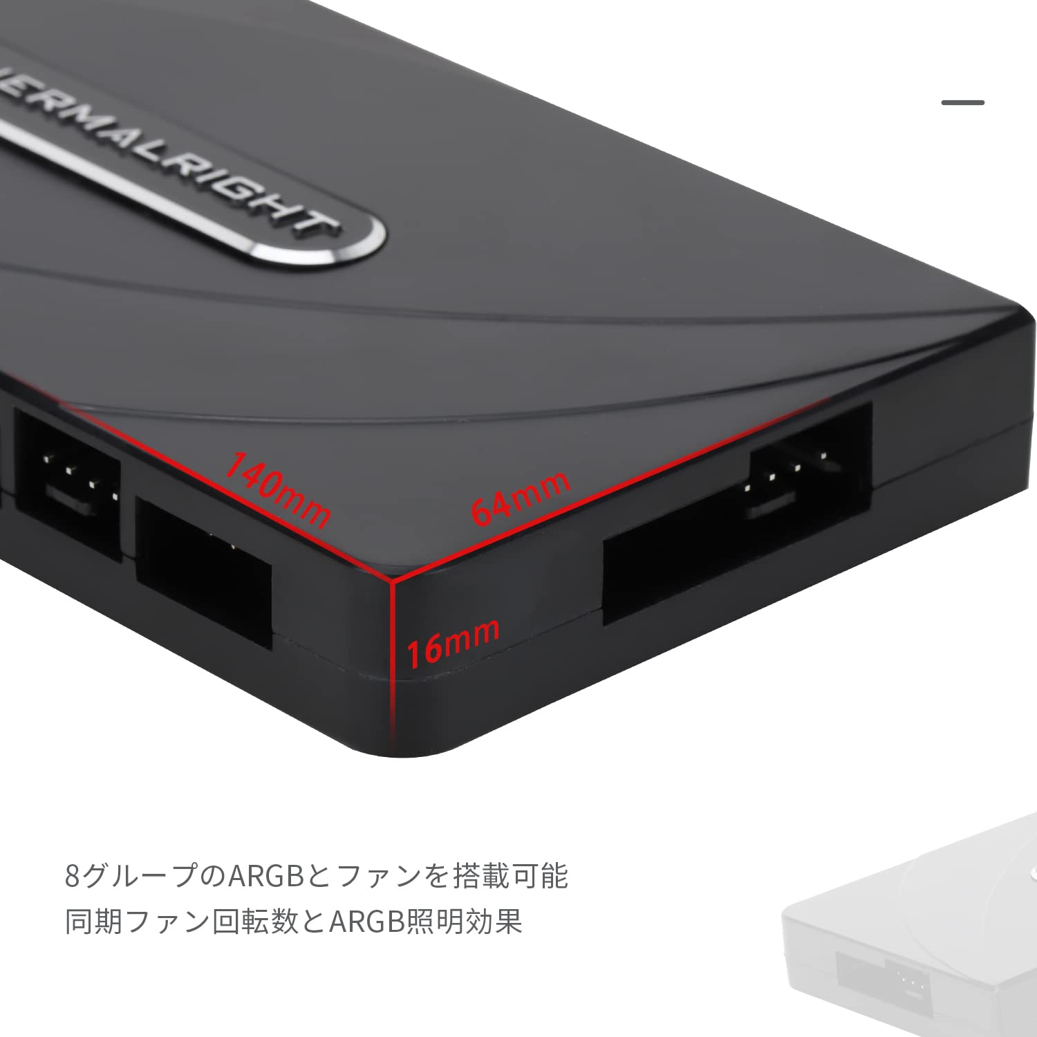 【仕様パラメータ】型式:FAN and ARGB HUB×8。サイズ:140×64×16 mm、材質:プラスチック、色:ブラック、重量:70 g、マザーボードARGB照明インタフェースとファン電源インタフェース不足の問題を解決しやすい