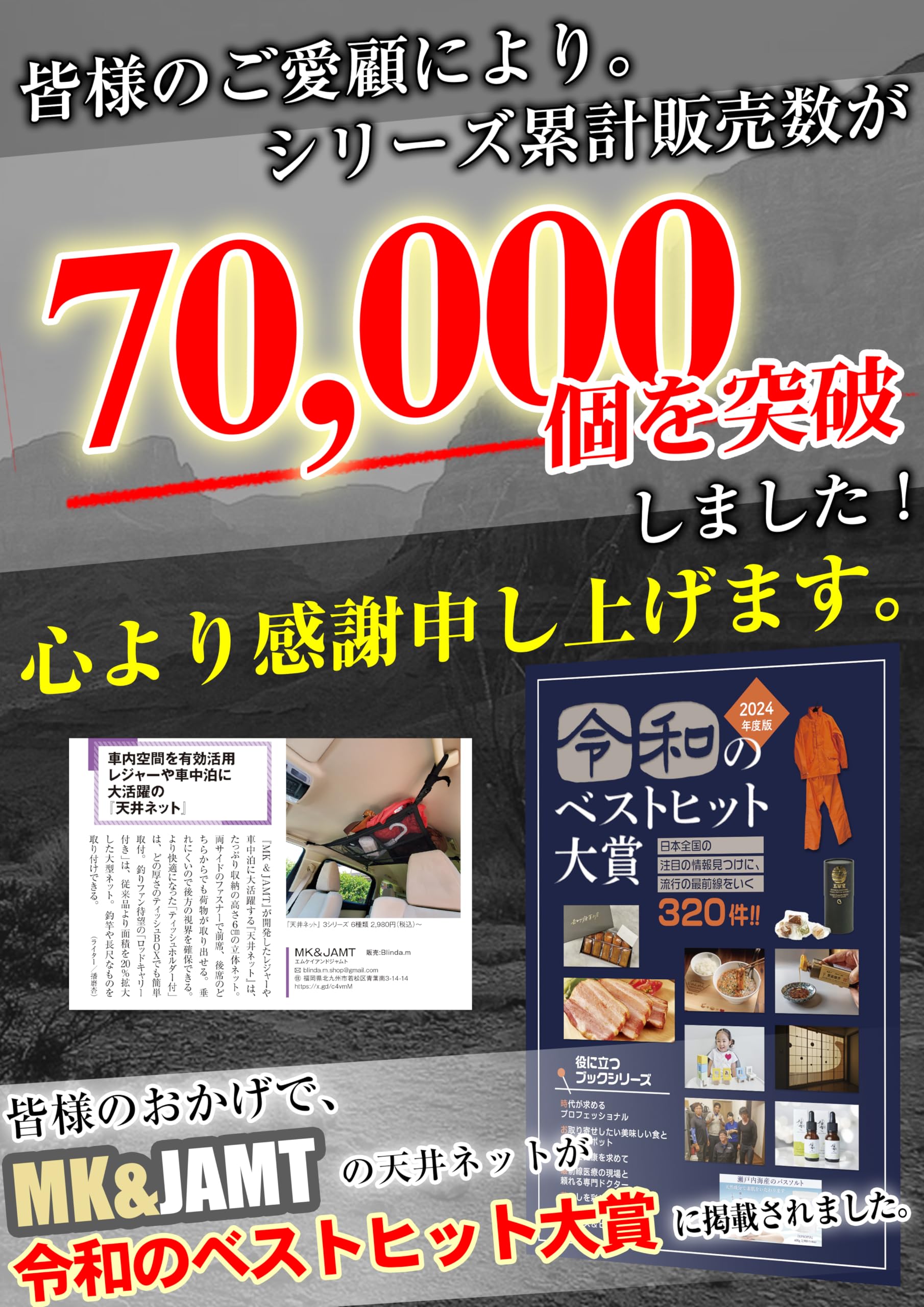 MK&JAMTでは、お客様の声を取り入れ、従来ネットに4つの改良を施しました。レジャーや車中泊に大活躍できることをお約束致します。4つ改良点は、①.ネット内に縦横2本ずつベルトを配置したことネットが垂れさがり難くなりました。②.ファスナーを両サイドに設置することで、前席、後席のどちらからでもネット内の荷物が取り出せるようになりました。③.高さ6cmのふくらみを天井側に設けることにより、荷物を入れることで下側に膨らむのを抑制して後方視界をより良く確保できるようになりました。④.ファスナーの裏にベルト生地を配置し、ファスナーが噛みこまない仕様になっています。日本人による日本での開発品です。日本の車の用途に合わせて改良しています。車の収納スペースの確保、荷物の出入れの利便性向上にお役立てください。