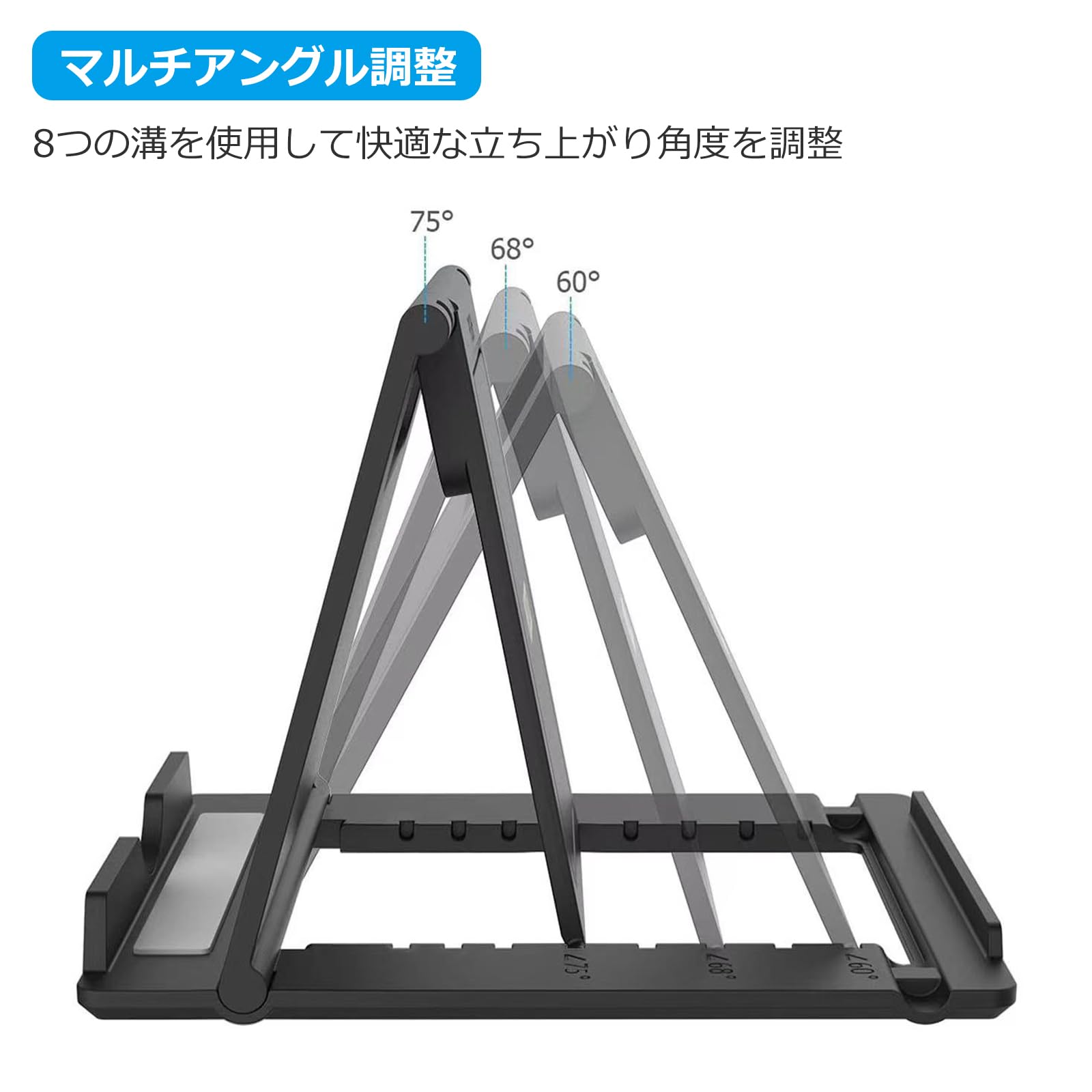 【マルチアングル調整可能】:8つのギアの角度を選択することができて、あなたはいつもあなたの好きなものを見つけることができます。この卓上タブレットスタンドは、スマートフォン、タブレットまたはポータブルディスプレイを快適な角度で置くことができ、ビデオの視聴、読書、録画、閲覧、対面通話などに最適です。