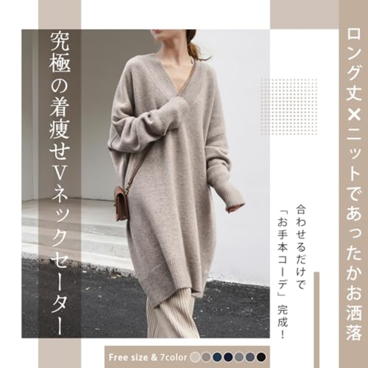 【究極の着痩せvネックセーター!】ロングめなレディースセーターは、体型カバー効果の高いアイテム。前後さのある長め丈は膝までカバー。体型カバーしつつ、着痩せ見えするコーディネートに仕上げてくれます。背肉・肩幅・バストライン・脇腹・腰まわり・お尻・太ももといったボディラインが目立つパーツの全てを覆い隠すことができるのでとってもありがたい存在!胸元は大きめにとったVネックデザインですっきりと見せ、ニットワンピにありがちなもたついた印象を払拭。
