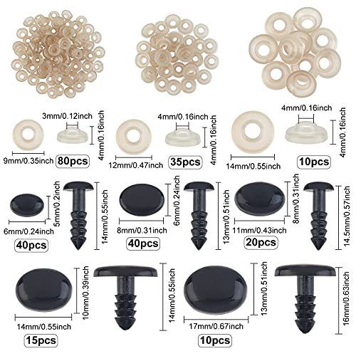 SUPERFINDINGS 楕円形 さし目 ぬいぐるみ目 動物 プラスチック 犬の鼻 125個入り プラスチック 6/8/11/14/17mm ブラック 5サイズ 目玉さし鼻 ワッシャー付きプラスチック安全目 ドールアイ ドールメイキング クラフト 手芸パーツ 手作り DIY人形制作キット