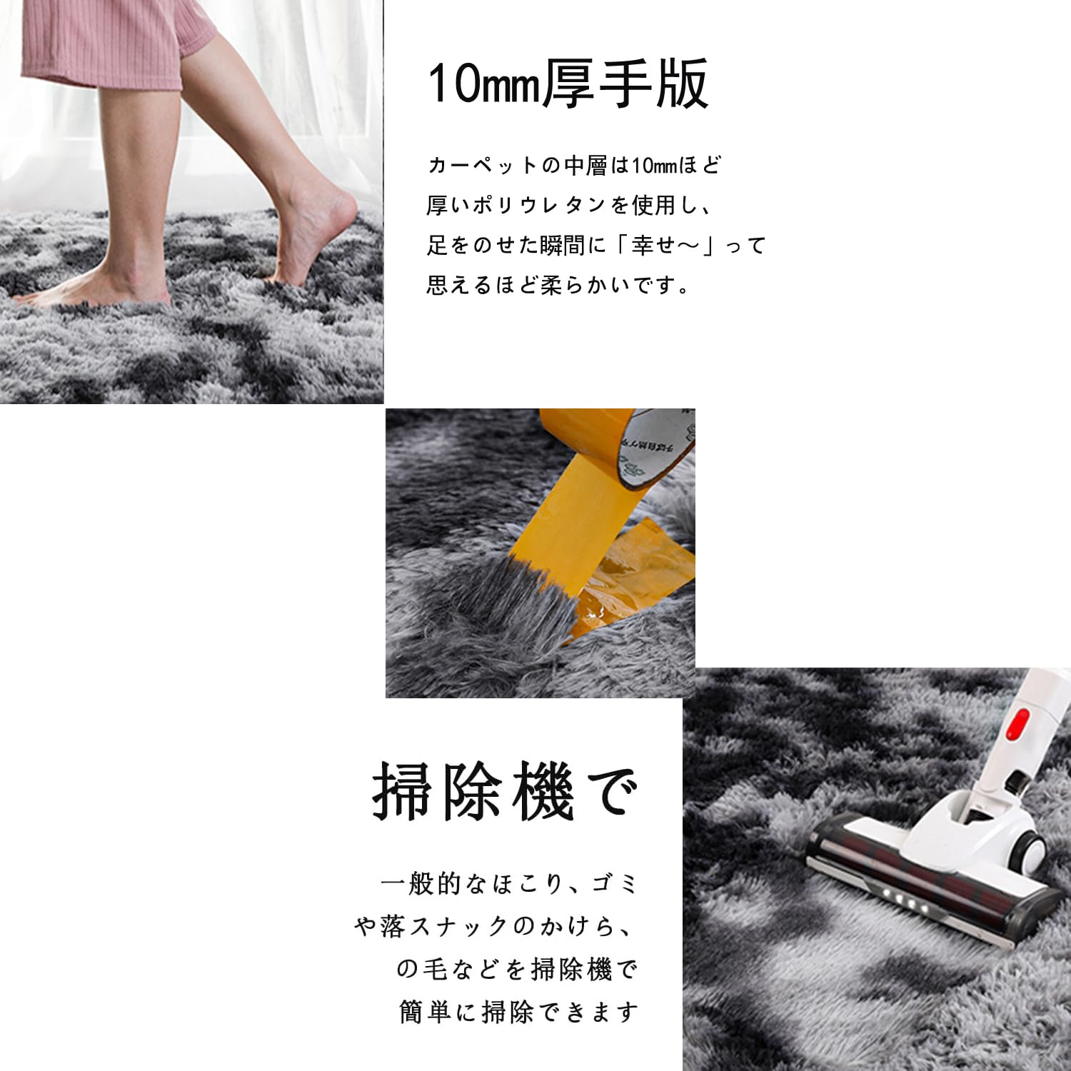 【極厚の中材・ふわふわ】SpyFlyLieのカーペットの中層は10mmほど厚いポリウレタンを使用し、足をのせた瞬間に「幸せ~」って思えるほど柔らかいです。リビングに敷くだけで部屋全体があたたかく、そして長時間座ったり寝転んだときでも、体が痛くなりにくいです。さらに、防音性にも優れていて、 歩行時の騒音を防ぐことができます