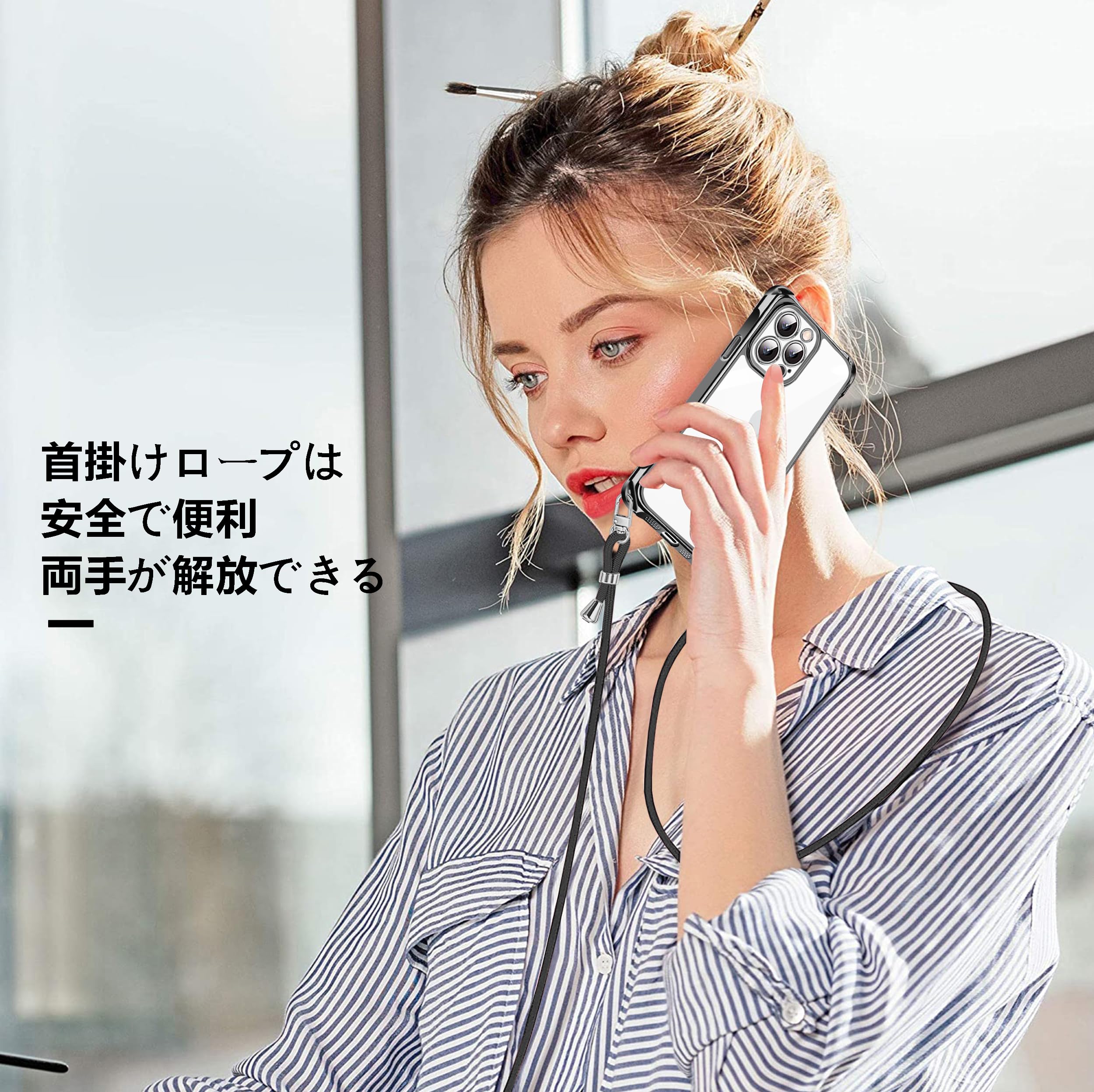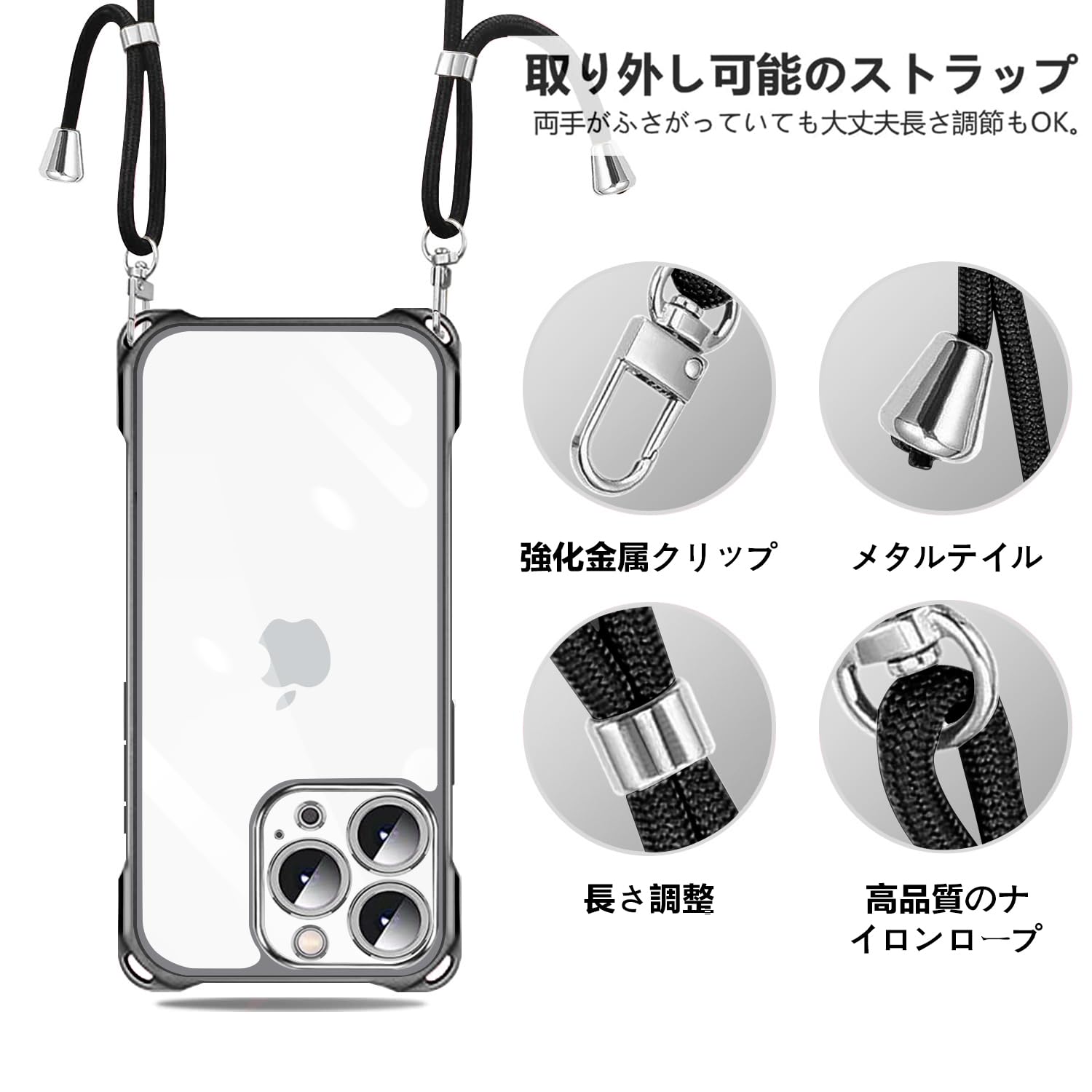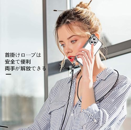 iPhone16Pro 用 スマホケース アイフォン16Pro カバー 肩掛け 斜めかけ 縄掛けケース 透明 TPU 薄型 軽量 耐衝撃 携帯ケース 紐付き 斜めがけ 織りストラップ付き ネックストラップ ショルダー ケース 縦/横 2WAY 長さ調整可能 取り外し可能 落下防止 紛失防止 ワイヤレス充電対応 (ブラック)
