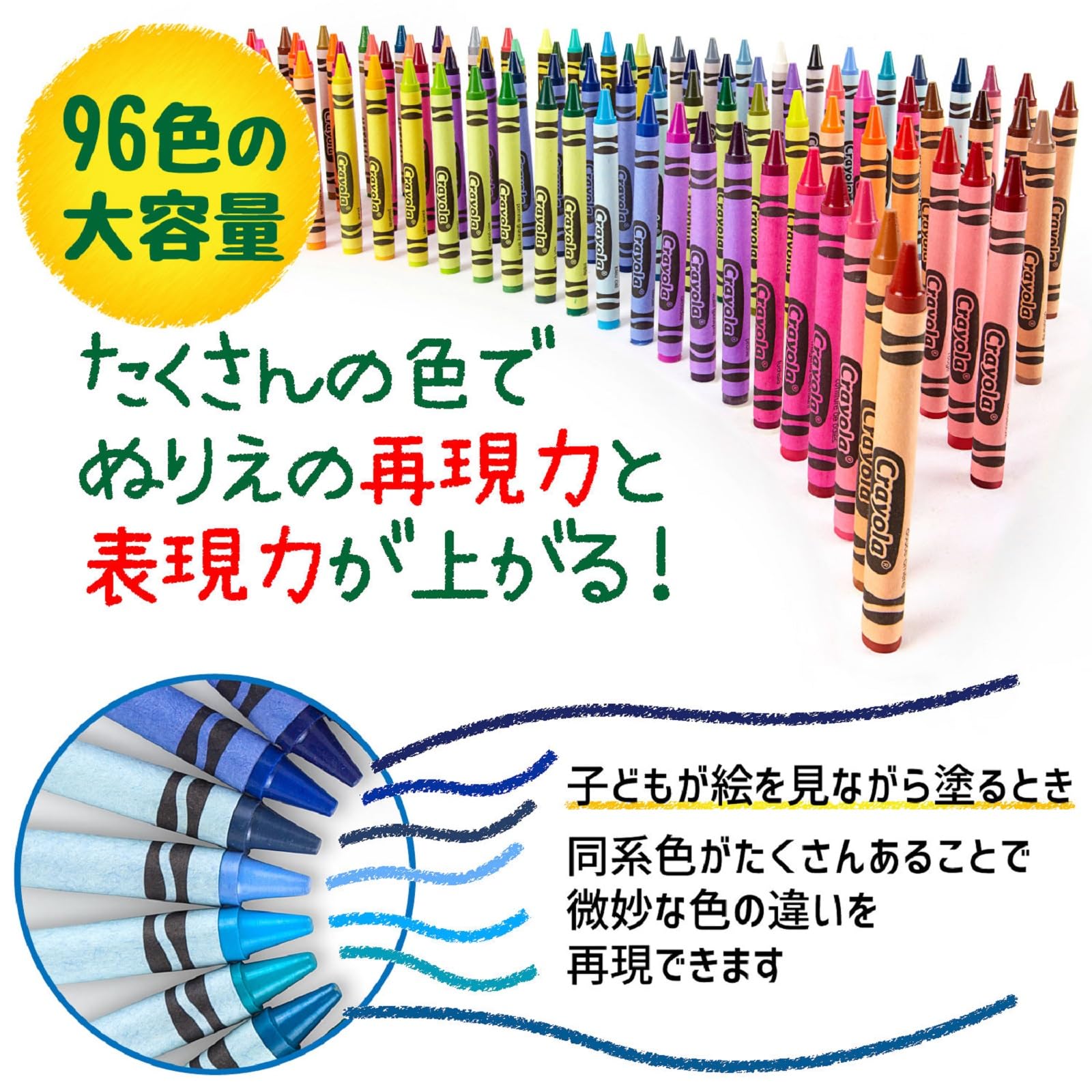 【商品概要】使いたい色が必ず見つかる96色セット。鮮やかな色合いのクレヨラのくれよんは、お子さまの感性をやさしく刺激するクリエイティブなツールです。収納ボックスにはシャープナーが付属しています。