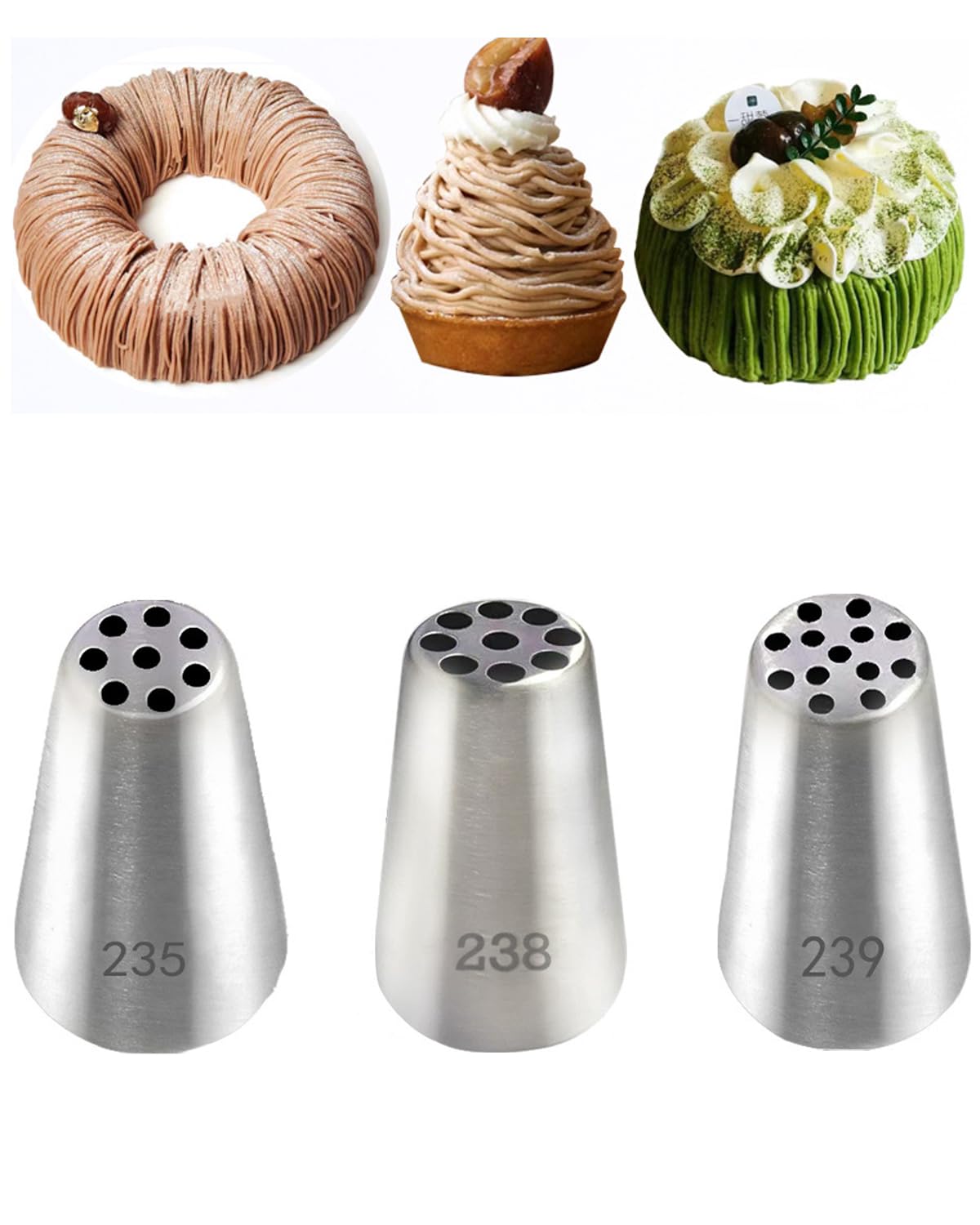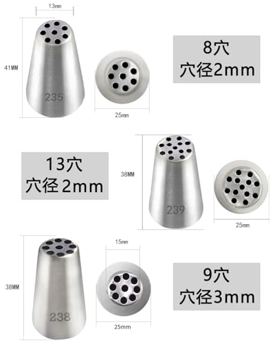 1.パッケージ内容:モンブラン口金*3個セット(8穴絞り口金+9穴絞り口金+13穴絞り口金)。それらを使用すると、完璧なケーキ、カップケーキ、クッキー、さらにはアイスクリームなどの任意のデザート用の装飾花を作ることができます。