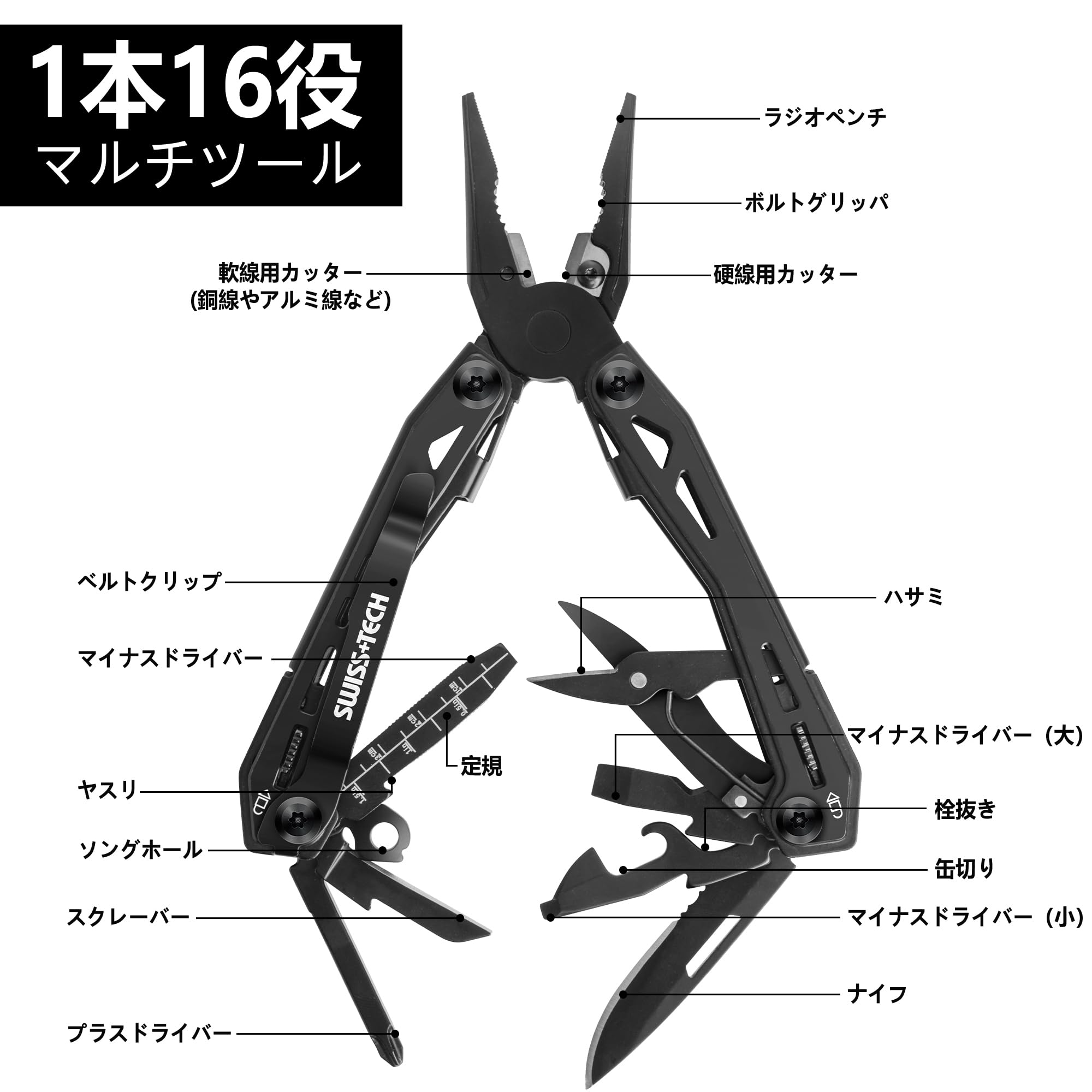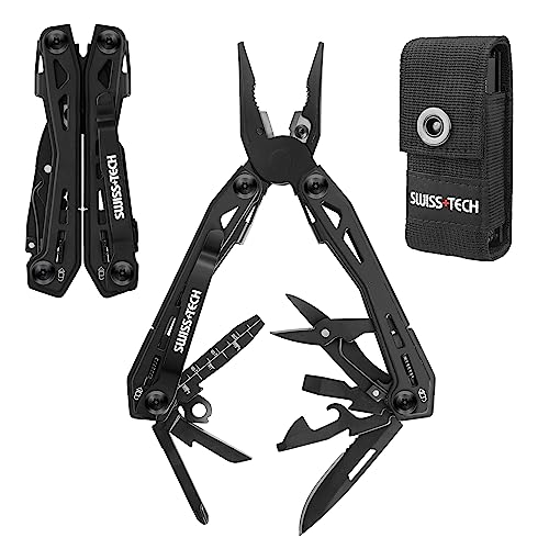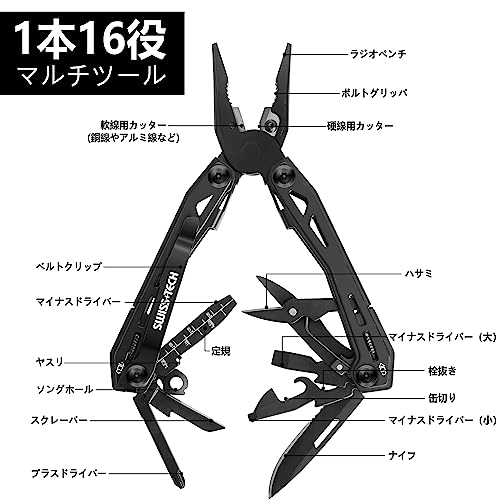 SWISS+TECH 多機能ペンチ アウトドアマルチツール 16-in-1 マルチプライヤー サバイバルツール ロック機能搭載 カッター 栓抜き ヤスリ 缶切り ドライバー 防災用 アウトドア DIY 登山 キャンプ 修理 防災 釣り ブラック