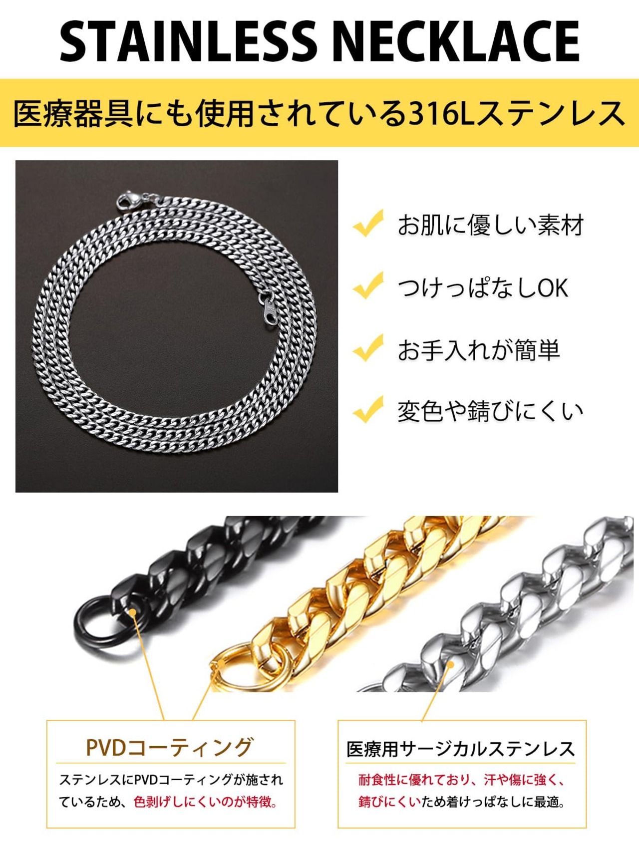 【ステンレスネックレス】地金はステンレスを採用。「錆びにくい」「アレルギー反応を起こしにくい」ので、お肌に優しい素材として人気です。