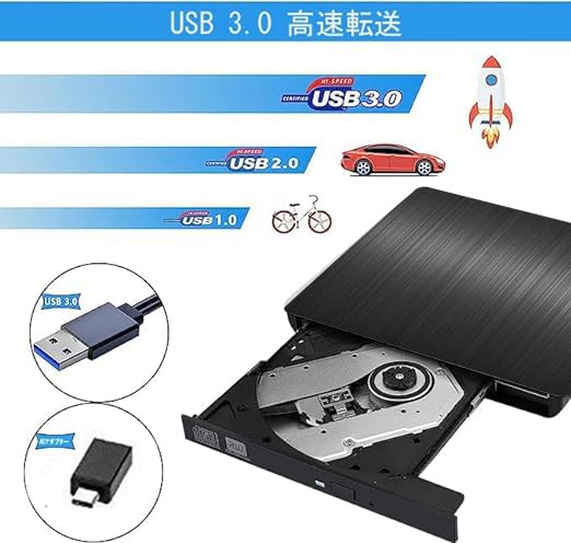 外付け DVDドライブ USB 3.0 type-c 外付CD・DVDドライブ CD/DVDプレーヤー 外付け光学ドライブ PC外付けドライブ ポータブルドライブ CD/DVDドライブ ノートパソコン CD/DVD読取・書込 DVD±RW CD-RW USB3.0/2.0 Window/Mac OS両対応 高速 静音 超スリム 薄型 コンパクト(Black)
