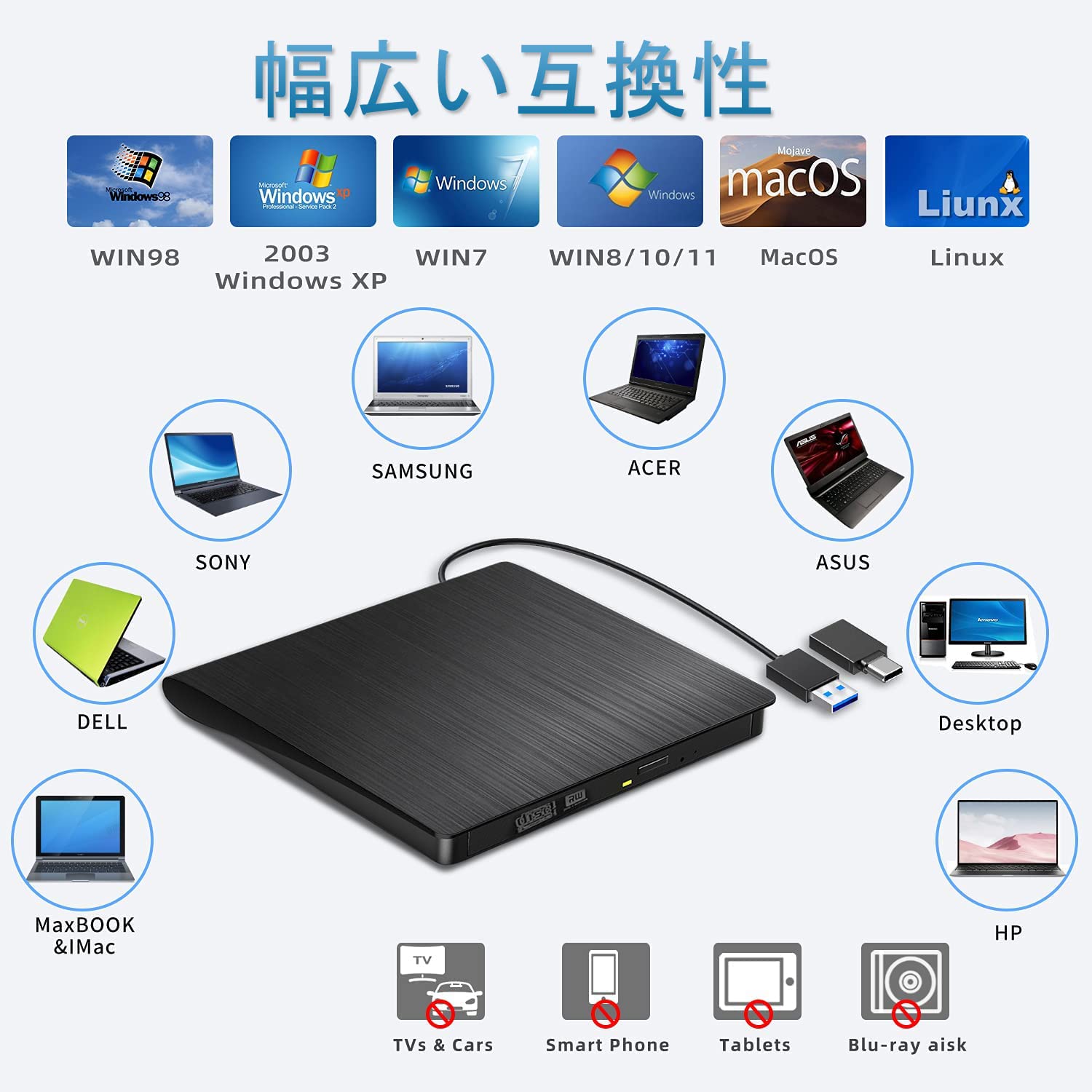 【優れた互換性】WindowsXP/Windows7/Windows8/Windows10/Windows11/Mac OS/Linux市販のパソコンシステム、ノートパソコン、デスクトップパソコンなどに対応できます。CD-R CD-ROM CD-RW CD-RAM,DVD+R DVD-R DVD-RW DVD+RW DVD-RAM DVD-ROM DVD-Videoなどをサーポートして、再生・書き込み・読み込みもできます。