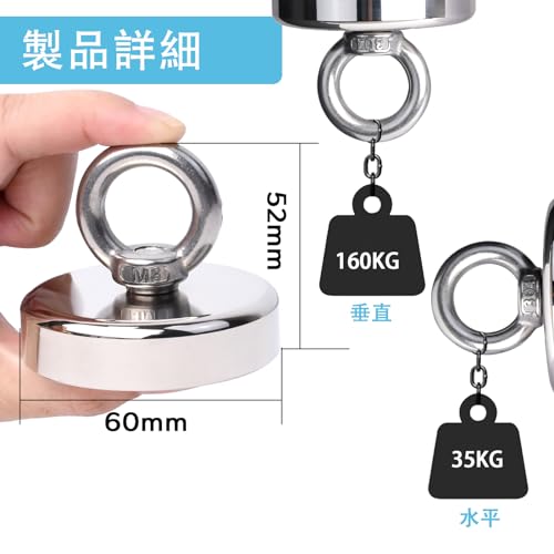 強力マグネットフック 直径60mm 強力磁石 フック 垂直耐荷重160kg 磁石 超 強力 磁石 フック 強力 ネオジム磁石 マグネットフック戸外 キッチン 倉庫 オフィス 壁掛け 浴室に適用