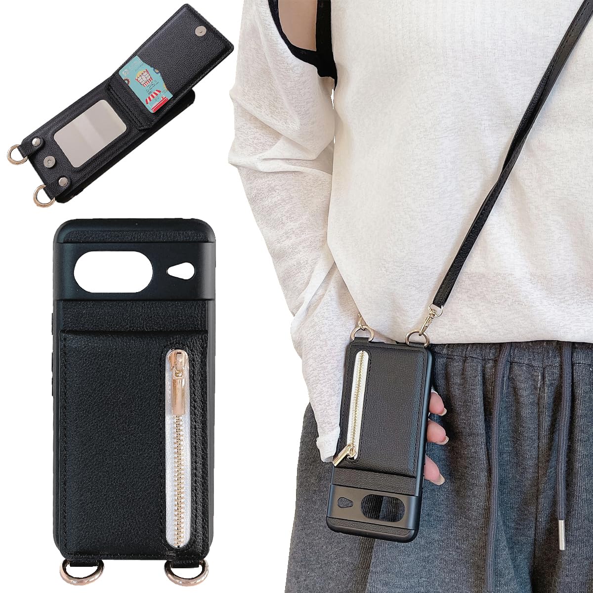 Google Pixel 8 ケース 高質レザー Pixel 8 カバー 肩掛け 首かけ 斜めがけ ショルダー ケース ミラーケース 便利 カードポケット スタンド機能 落ち着いた色 調節可能 軽量 多機能 縦置き ICカード収納 財布型 耐衝撃 携帯 鏡付き ケース ブラック