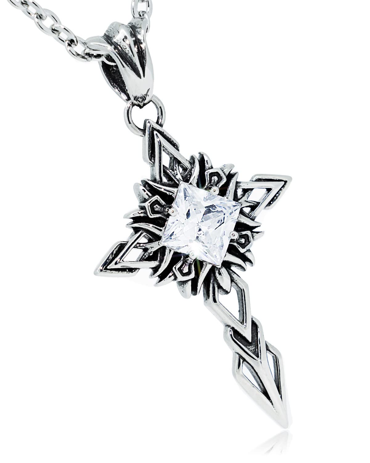 【存在感のあるネックレス】大粒の正方形キュービックジルコニアが中央で輝くデザインの人気のロザリオネックレスです。ステンレス部分は精巧な作りのメンズネックレスです。