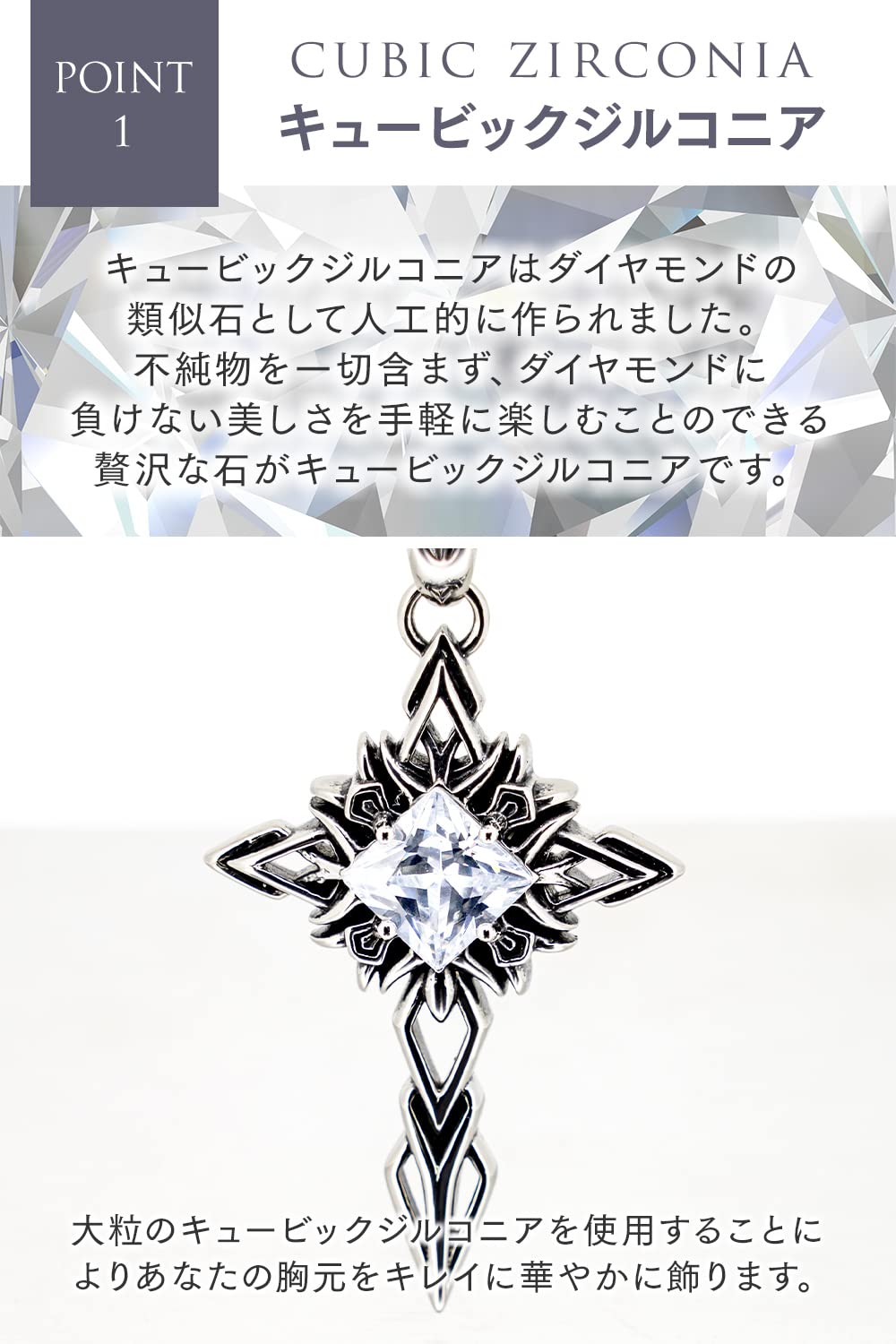 【ダイヤモンドのような輝き】キュービックジルコニアはダイヤモンドの類似石として人工的に作られました。ダイヤモンドと比較しても屈折率や透明感は非常によく似ています。
