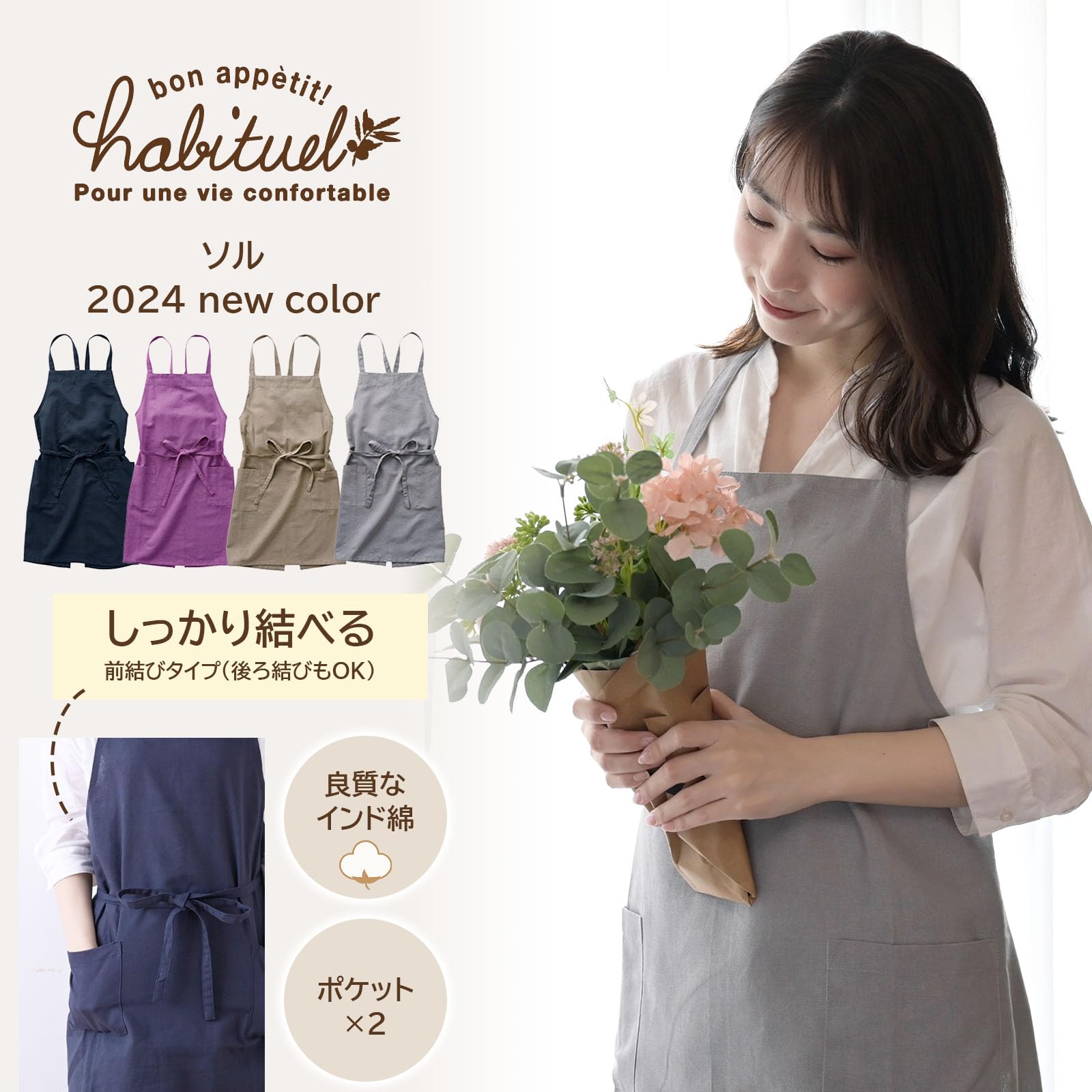 【シンプルでおしゃれ】人気のアビチュアル・ソルシリーズから新色(ベージュ・ライトグレー・ネイビー・ピンク)のエプロンが登場です。無地のデザインでお洋服を選ばず、レディース用・メンズ用どちらにもお使いいただけます。
