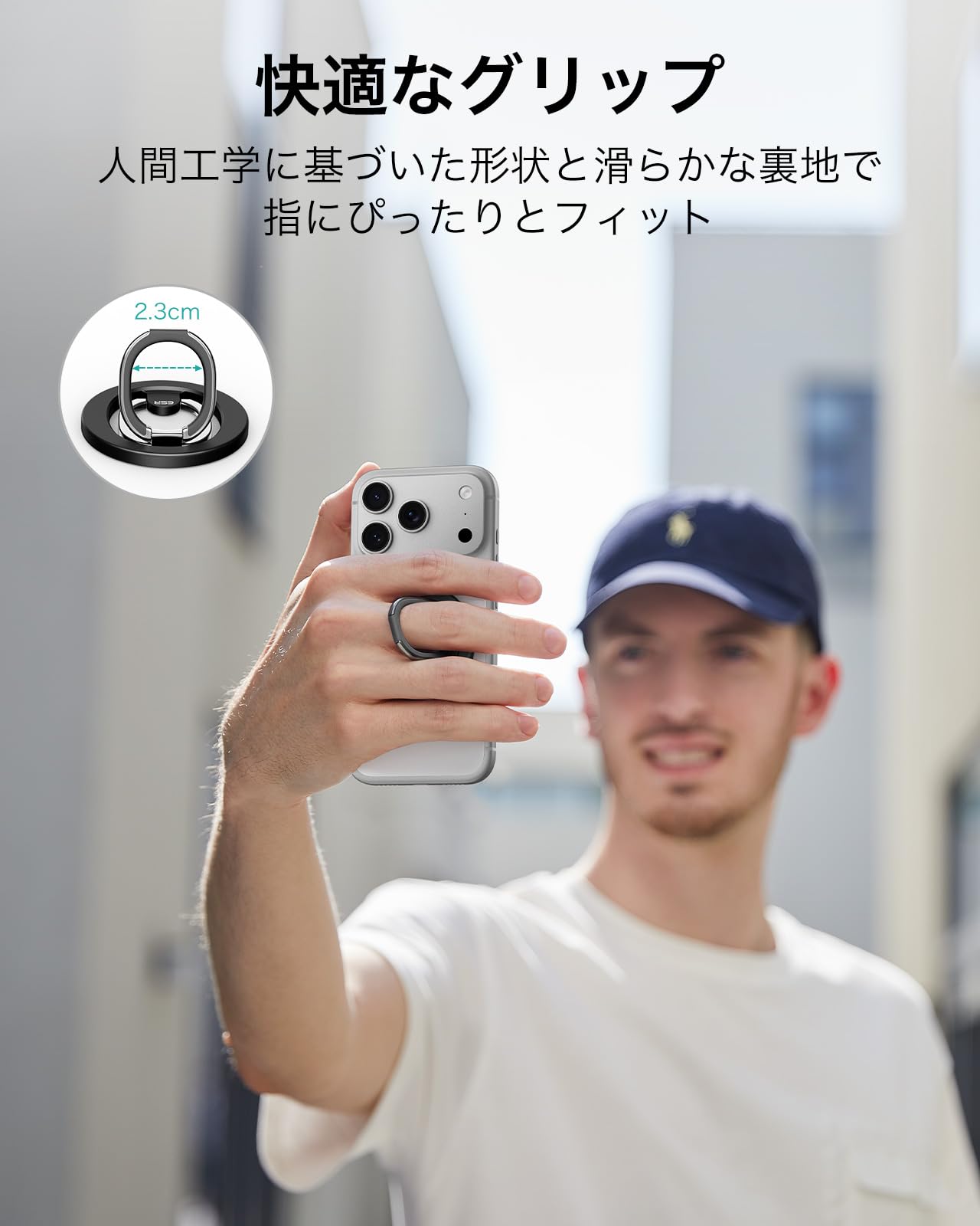 【快適なグリップ感】直径2.3cmのリングには、TPE裏地が特別にデザインされ、指にぴったりフィットし、しっかりと快適にグリップ可能。