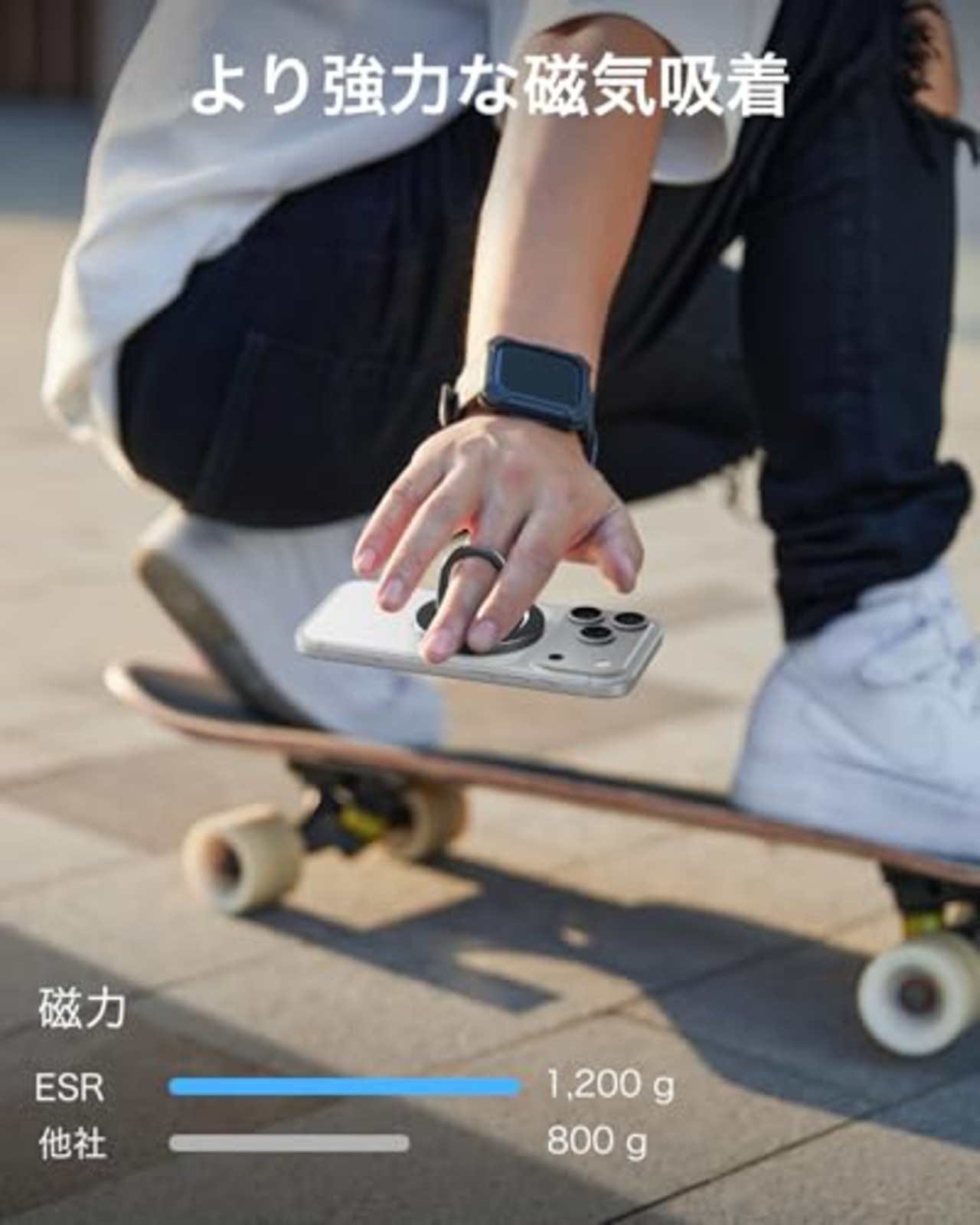 【強力な磁気吸着】1,200 gの吸着力を持つ磁石により、ケースなしのスマホや MagSafe/HaloLockケース付きのスマホをしっかり吸着し、必要に応じて簡単に取り外し可能。