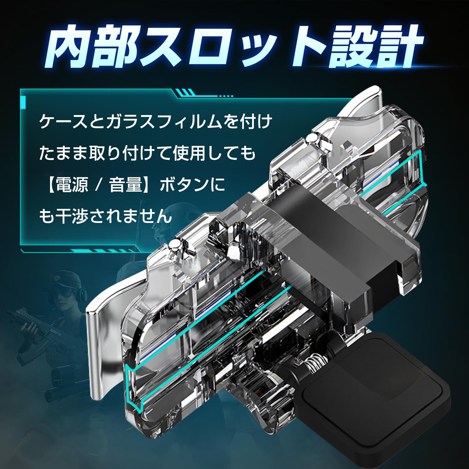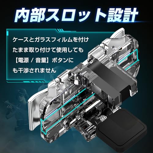 【新デザイン登場】お客様から頂いたご意見を新型に反映しました! ゲームパッドの改善点:①プレイ中の視野を邪魔しにくい透明タイプ②背面と接触する部品にシリコン材料を採用し、プラ素材に比べ滑りにくく、背面ガラスやケースが傷つきにくい。③電源ボタン・音量ボタンの干渉を防ぐ切れ込み溝を追加。④新設計,取り付けに便利な左右共用タイプ,⑤無段階調整で固定が可能。幅広い機種に適応、ガラスフィルムやケースを付けたままでも簡単装着(対応厚さ:約11mmまで
