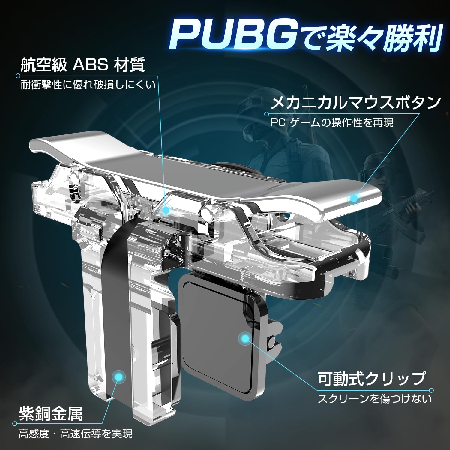 【クリック感あり】pubg コントローラー新設計,マウスのようなクリック感があり、緊迫する状況下での「誤射・ムダ撃ち」が避けられます。タップタイプと比べ射撃感があり、よりリアルな操作感が得られる上、指が疲れにくくゲームに集中できます