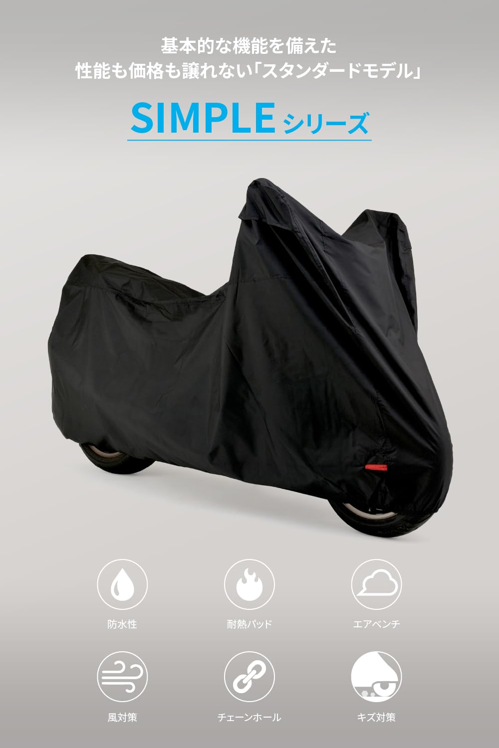 耐熱パッド付属:マフラーの熱からバイクカバーを守る耐熱パッド(23×70cm)付属。バイクのマフラー位置に合わせて、バイクカバー内側に貼り付けて使用