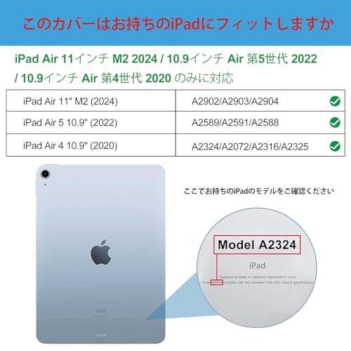 適用機種:iPad Air 11インチ M3 2025(A3267 A3270)、iPad Air 11インチ M2 2024(A2902 A2903 A2904)、iPad Air 第5世代 2022(A2588 A2589 A2591)、iPad Air 第4世代 2020(A2324 A2072 A2316 A2325) 10.9インチ、その他の型式に適用されません。ご購入前、お持ちのiPadのモデル番号をご確認いただきます。