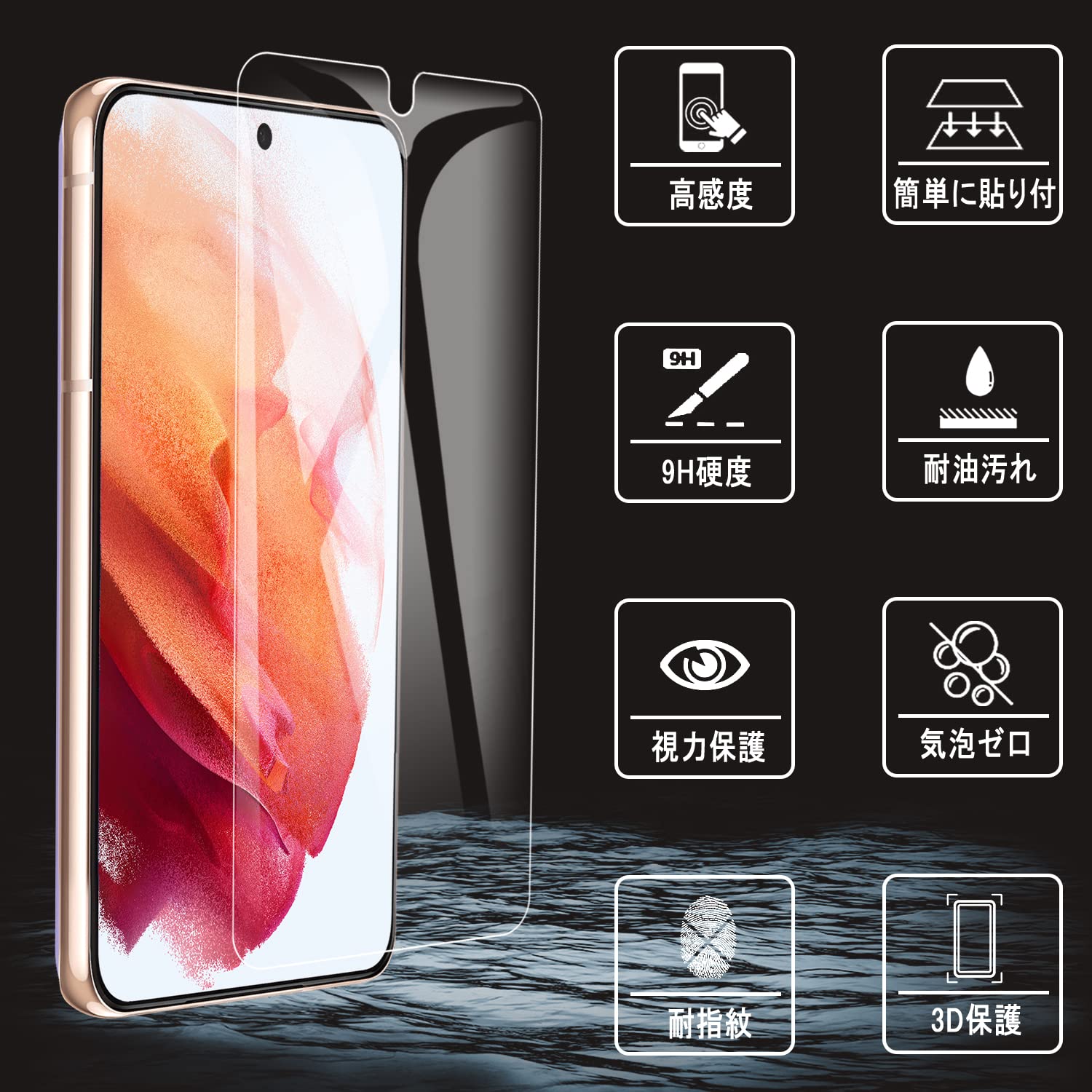 【自動吸着、気泡防止】フィルム接着面に吸着に優れたシリコンコーティングを施しているので、シリコン自動吸着層をもっており位置を合わせて置くだけで気泡なしで貼れ、フィルム貼りことが苦手の方でも簡単に貼る事が可能です。