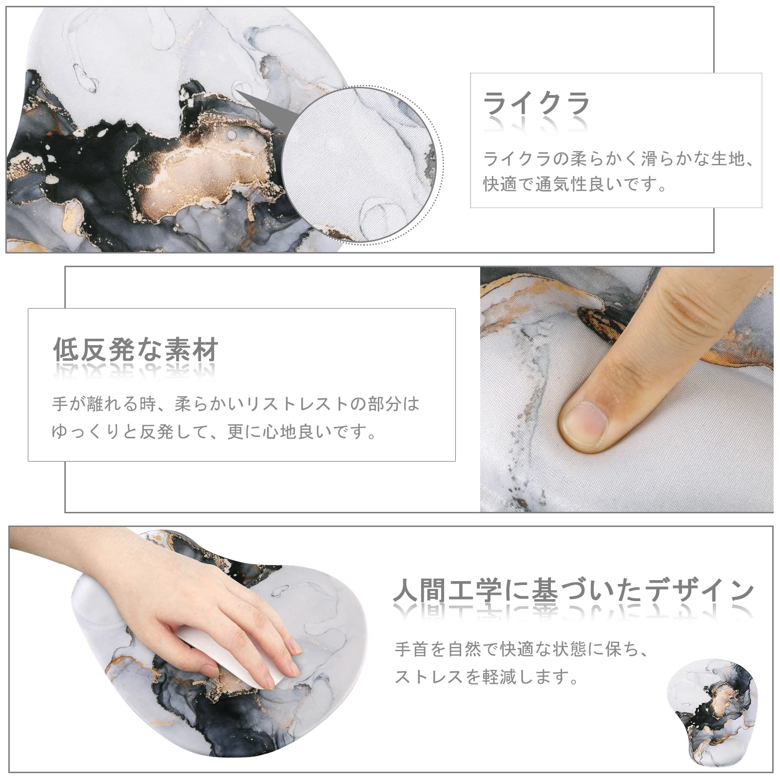 iCasso マウスパッド リストレスト一体型 防水 25×21cm 大理石柄 パームレスト 疲労低減 手首クッション 滑り止め 人間工学 ゲーミングマウスパッド おしゃれ 低反発 オフィス/ホーム用(グレーゴールド)
