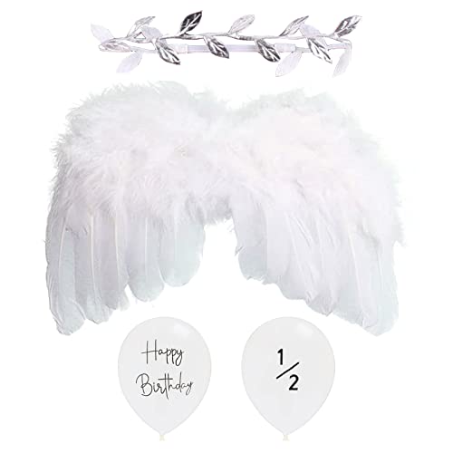 [BTtime] 天使の羽 赤ちゃん エンジェルセット 飾り 衣装 羽根 ヘアバンド 天使羽 ハーフバースデー バルーン 風船 寝相アート 可愛い エンジェル 舞台 写真 撮影 新生児用 (ホワイト)