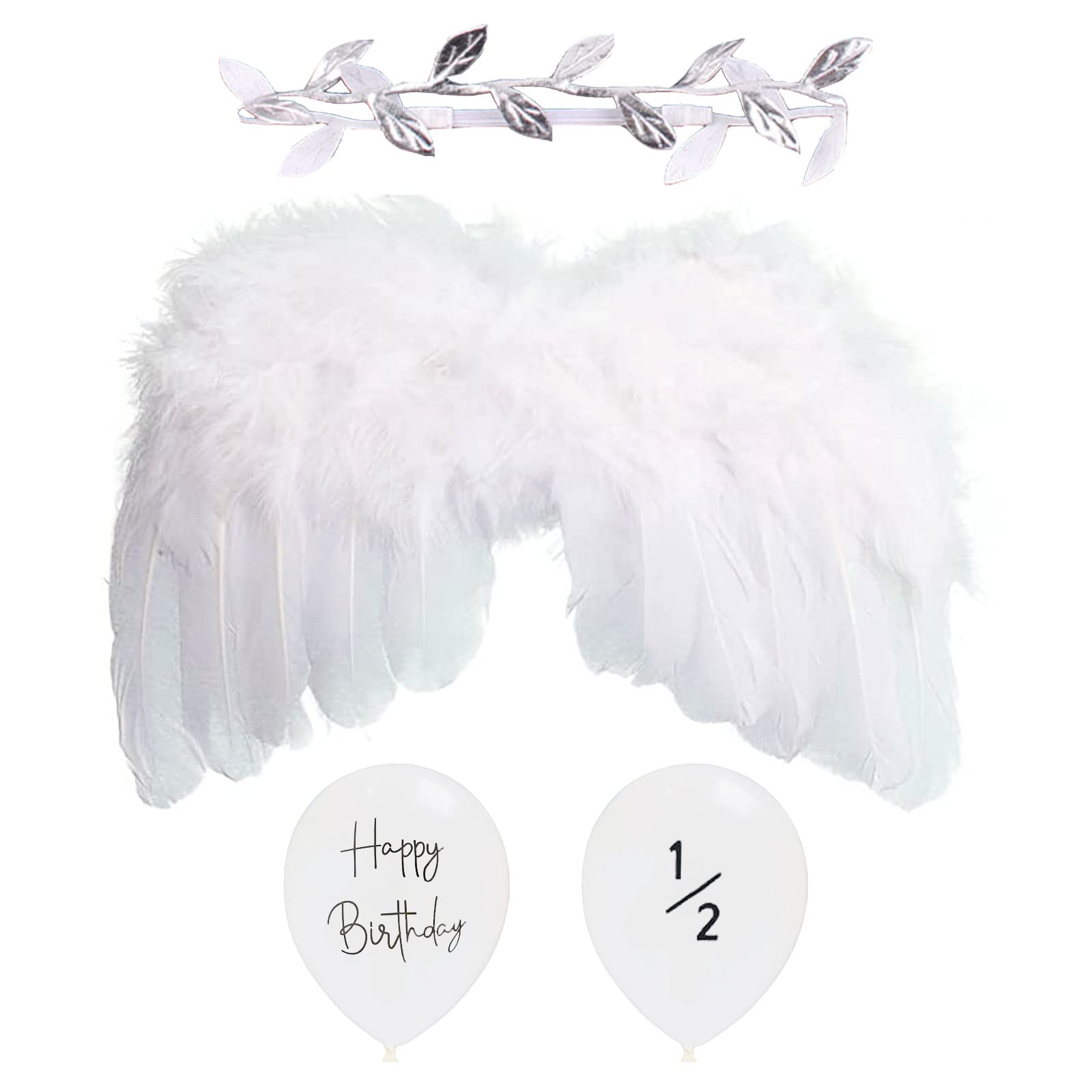 【4点セット】天使の羽1個 + シルバーヘアバンド1個 + ハーフバースデーバルーン2個。ヘアバンドのサイズ:平置き約15.5 cm×3.5 cm。天使の羽のサイズ:約28 cm×18 cm。