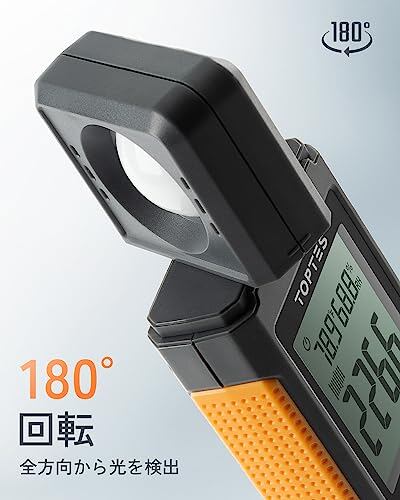 180°回転探頭と5.5cm大画面液晶: TopTes TS-710携帯型の光度計は180度回転可能なセンサーを備え、複数の角度から精密な光の測定が可能です。この高速応答センサーは0.5秒ごとにサンプリングを行い、連続的な測定データを提供します。バックライト付きの5.5cm LCD画面で、低光状態でも簡単に読み取ることができます