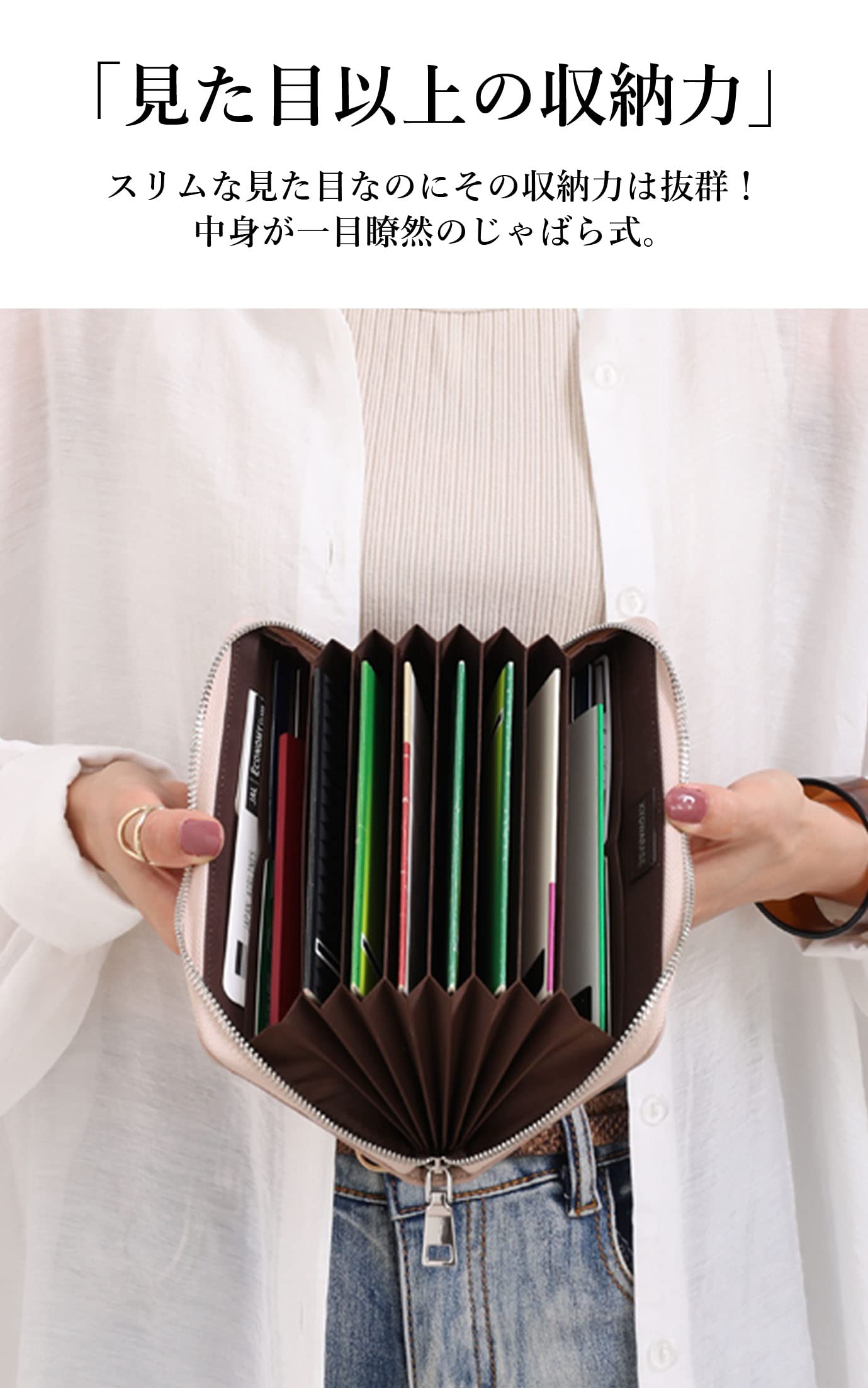 【見た目以上の収納力】通帳ポケットが8枚、カードポケットが12枚、お札などを入れるポケットが2つとこのサイズでこの収納力はクラス最高です。