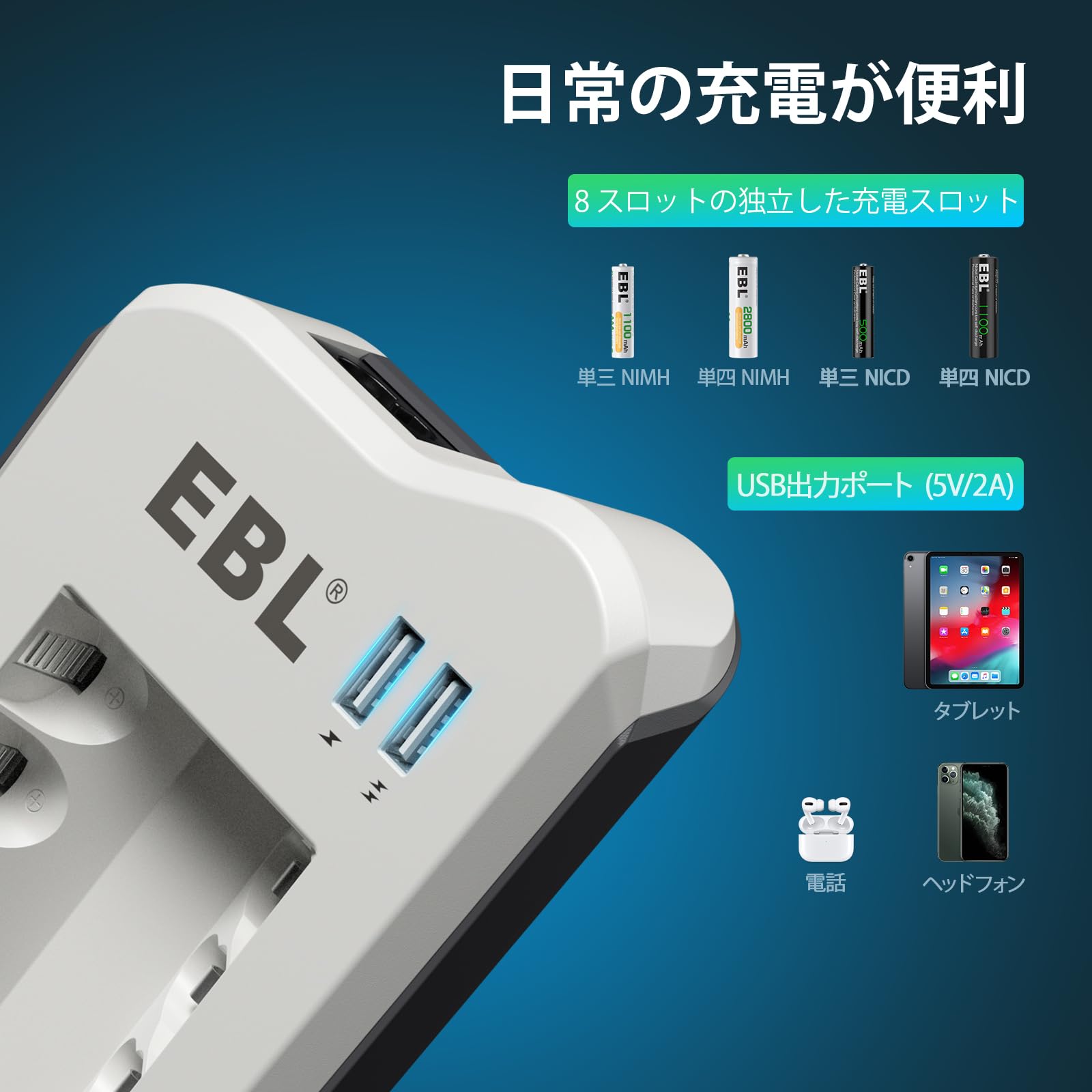 「AC&USBのダブル機能」ACで充電池を充電出来ます。それにUSBポートがあり、同時にスマートフォン、タブレット、カメラー、MP3、MP4などのような5V USBデバイスを充電することができます。