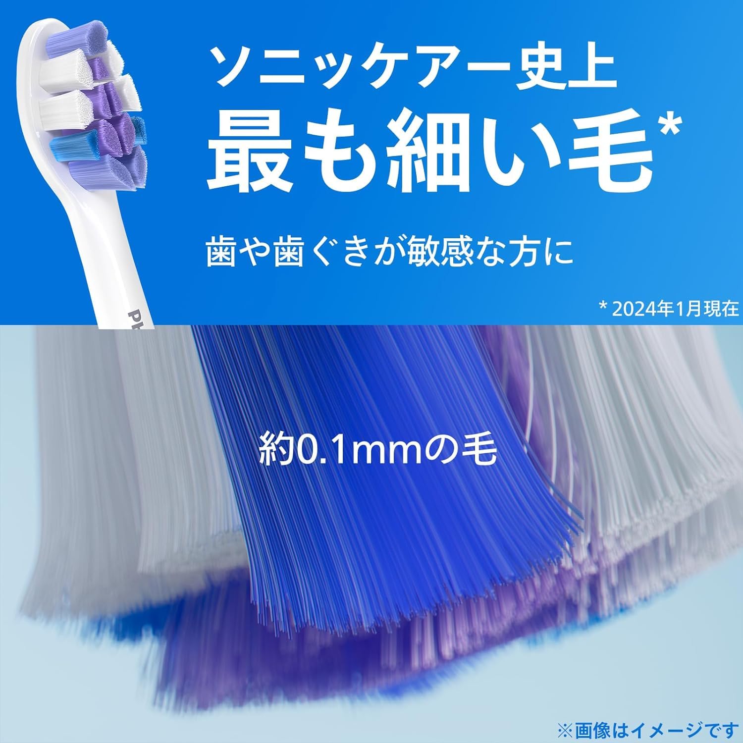 【ソニックケアーブラシヘッド】最も細い毛ジェントルプラスブラシヘッドは約0.1mmの毛を採用し、歯ぐきをやさしくケア